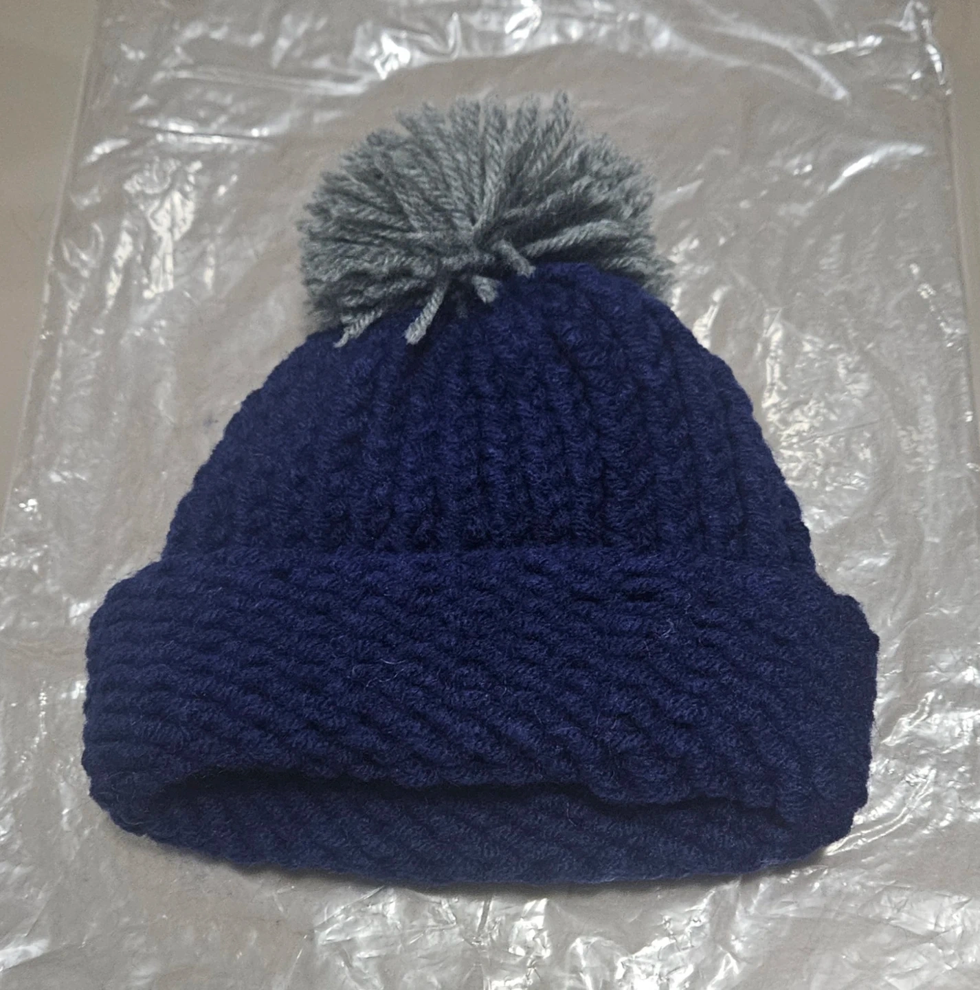 Navy Blue Knit Beanie with Grey Pom-Pom