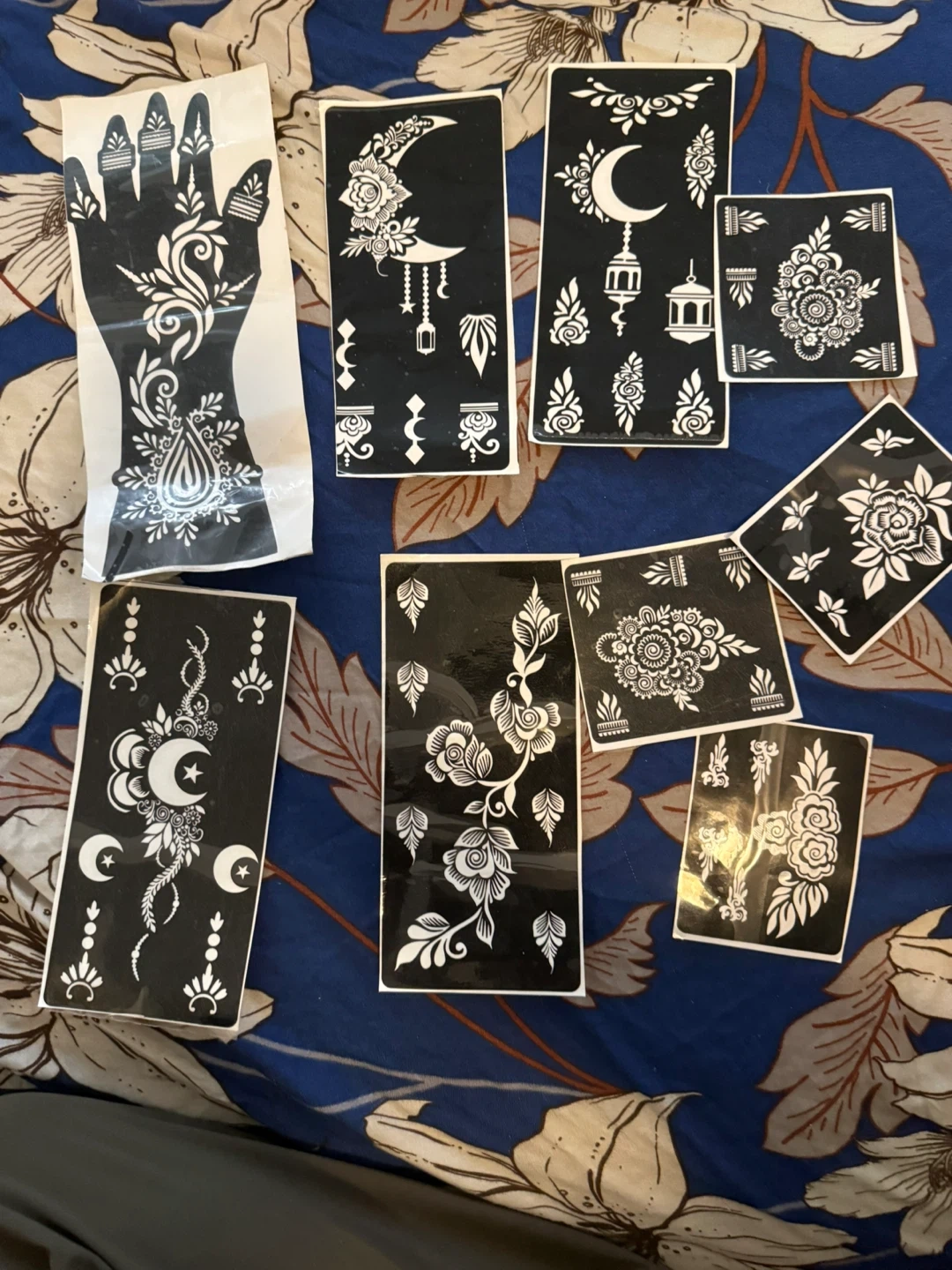 This set includes a variety of henna tattoo stencils featuring floral and moon designs. Designs include a full hand stencil, various arm and finger designs, and individual patterns.