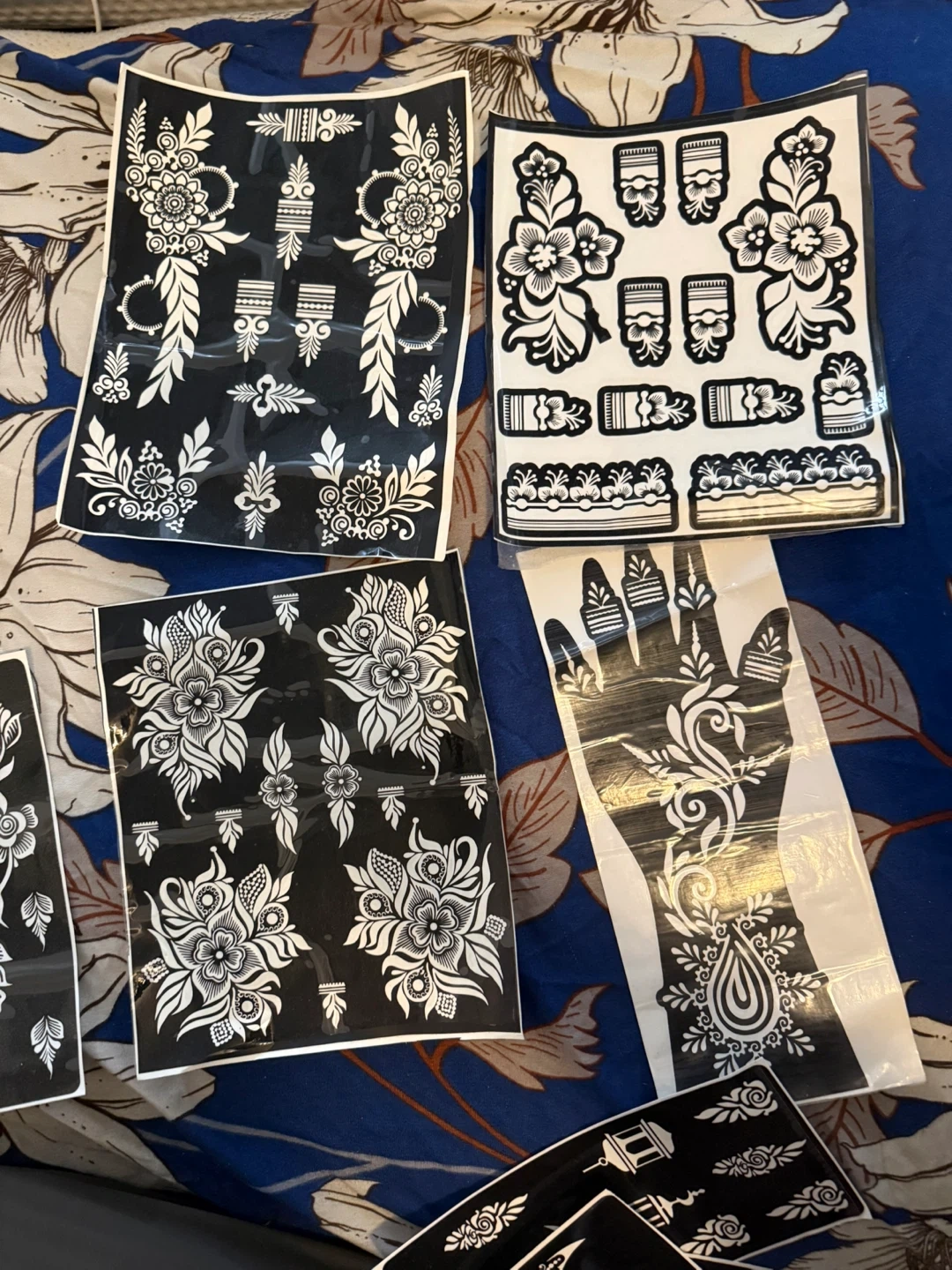 This set includes a variety of henna tattoo stencils featuring floral and moon designs. Designs include a full hand stencil, various arm and finger designs, and individual patterns.