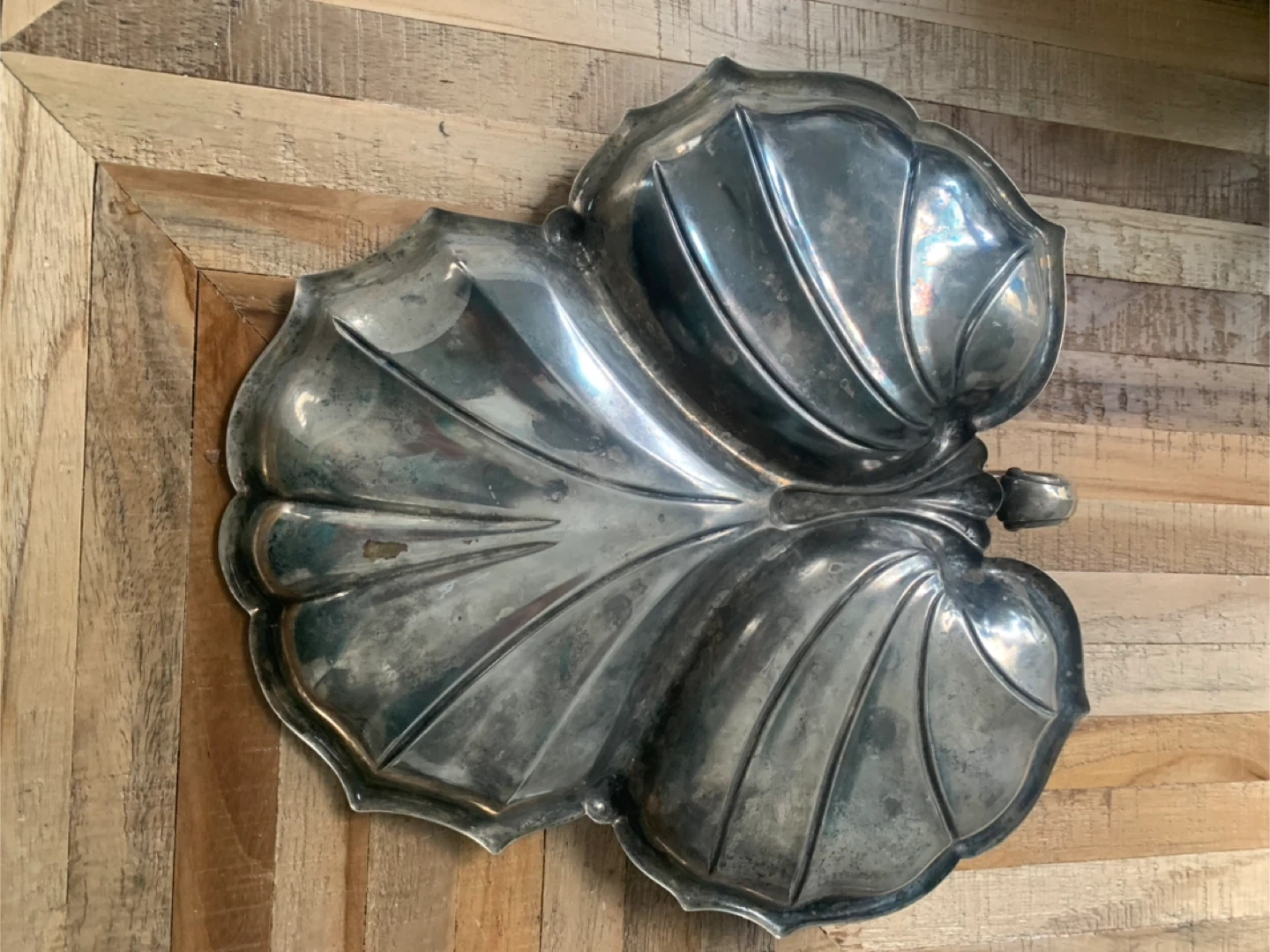 Beautiful silver-plated serving dish shaped like a leaf. It has three compartments, perfect for serving nuts, candies, or appetizers. This vintage piece adds a touch of elegance to any table setting!