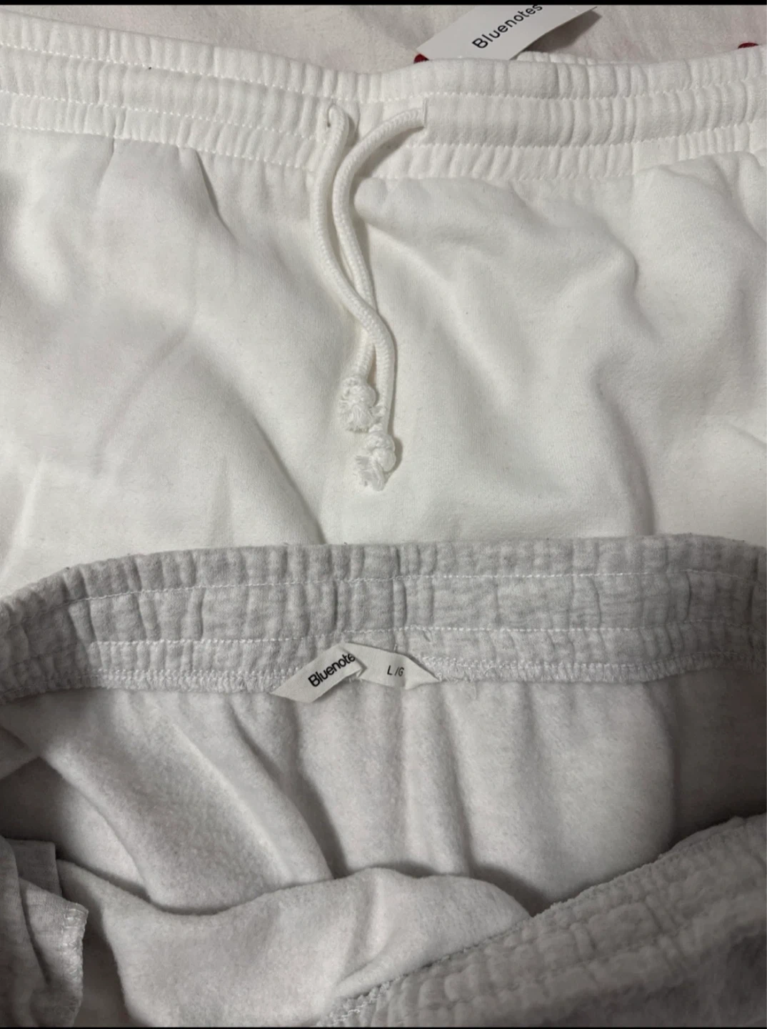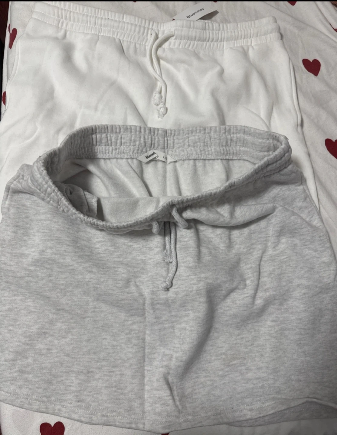Two of Bluenotes cotton skirts, one white and one grey. Both are size LARGE. They feature an elastic waistband with a drawstring. Great for lounging or casual wear!
