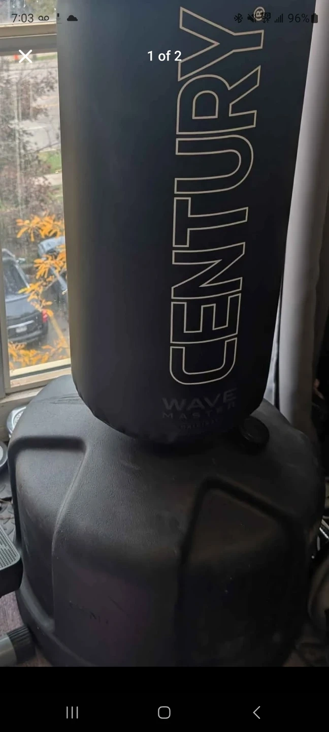 This is a Century Wavemaster freestanding training bag. It's designed for martial arts and fitness training. The bag is made of durable black vinyl with a sturdy base.