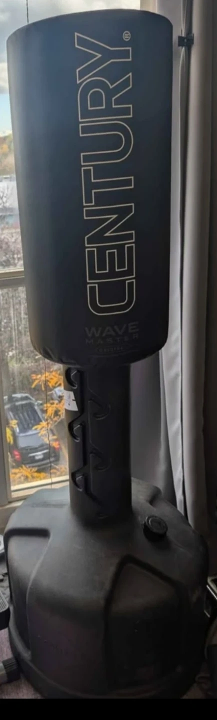 This is a Century Wavemaster freestanding training bag. It's designed for martial arts and fitness training. The bag is made of durable black vinyl with a sturdy base.