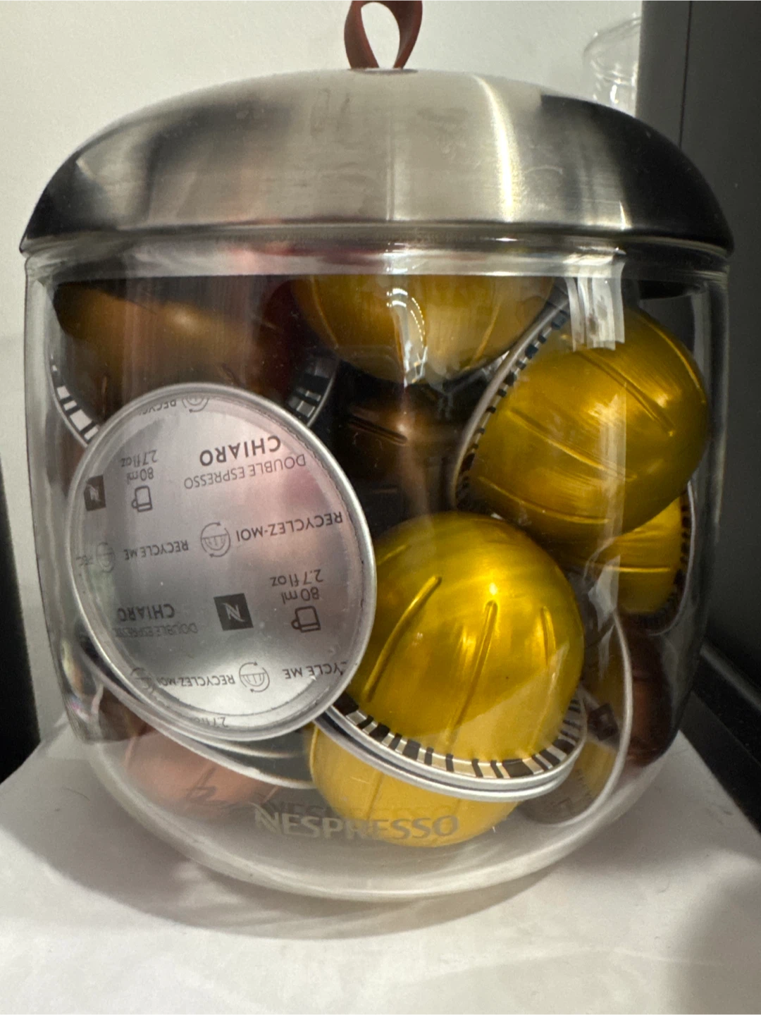 Lightly used! Comes with a whole cute Nespresso glass jar FULL of pods
