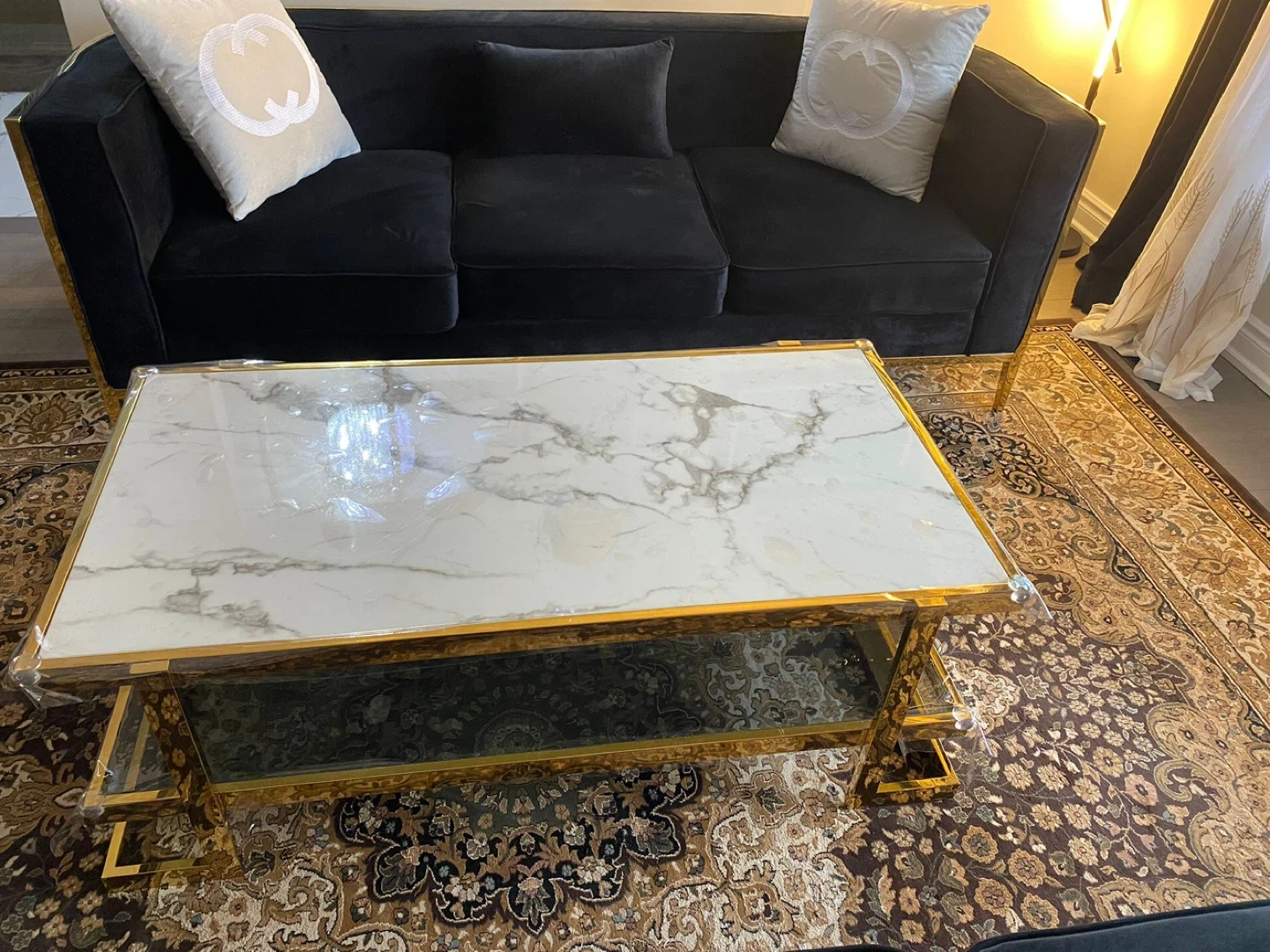 Luxurious black velvet sofa featuring stylish gold metallic detailing on the frame. It's designed with a curved silhouette for a modern look. Perfect for adding a touch of elegance to your living space!