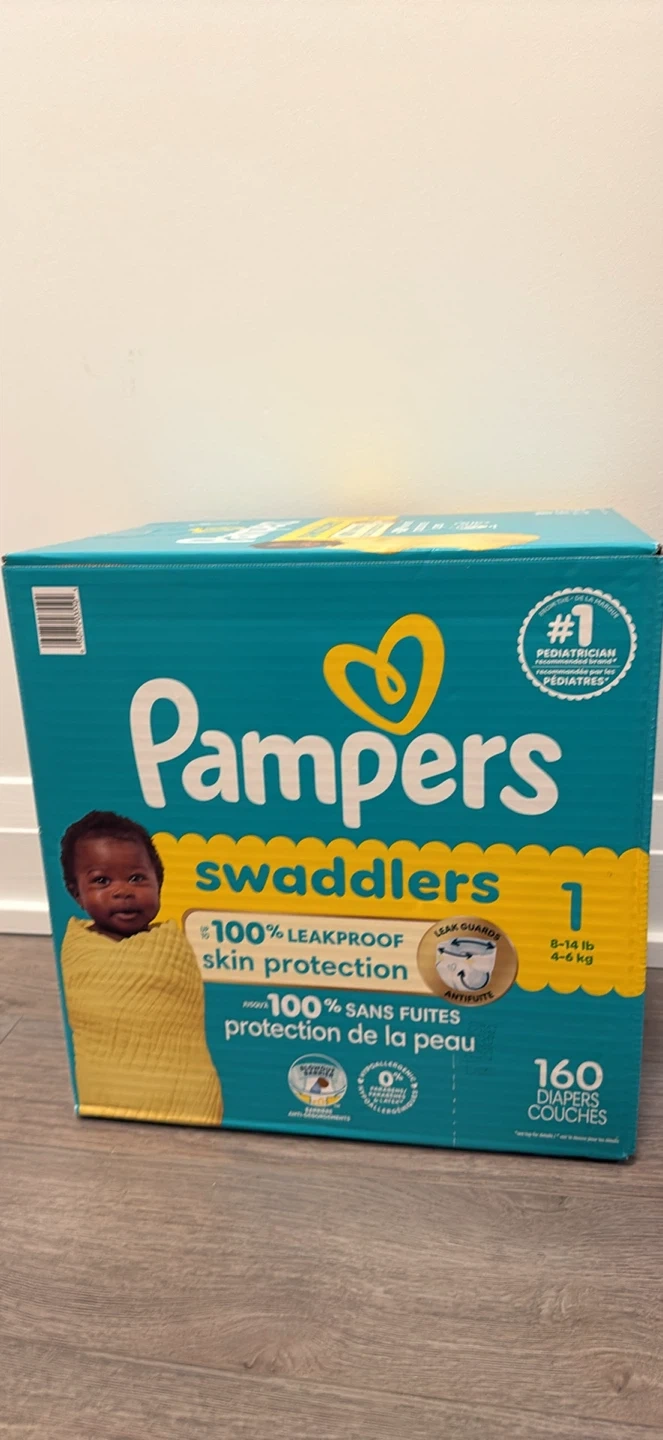 Selling a box of Pampers Swaddlers diapers, size 1. These are designed for babies weighing 8-14 lbs (4-6 kg). The box contains 160 diapers, offering 100% leakproof skin protection.