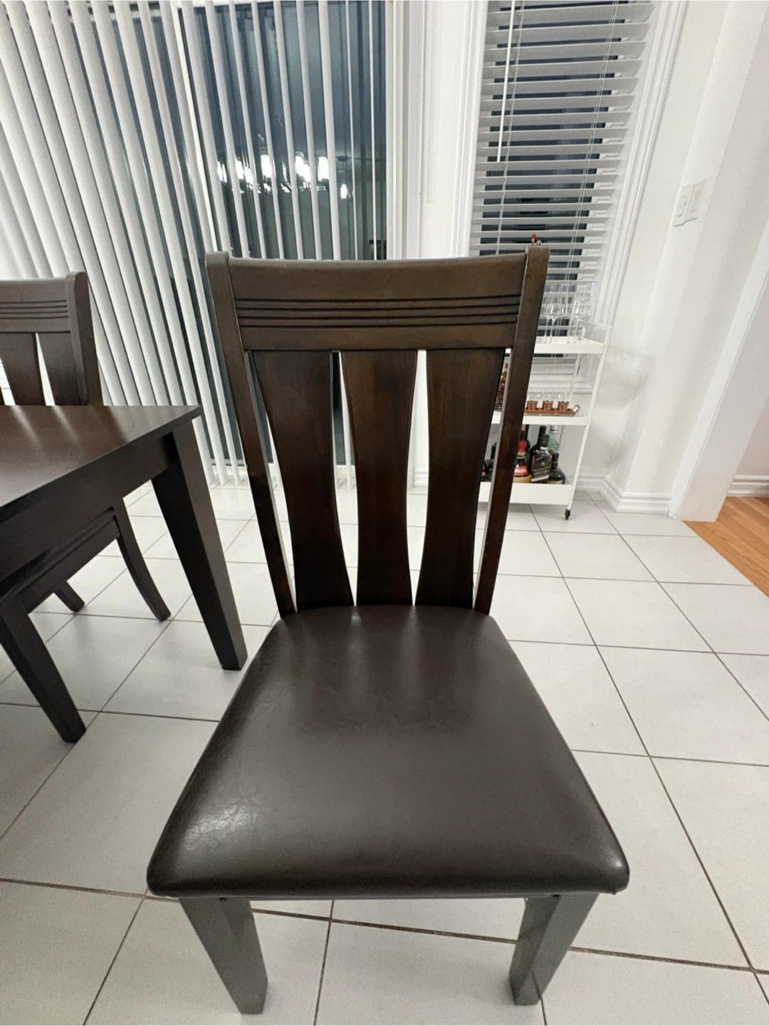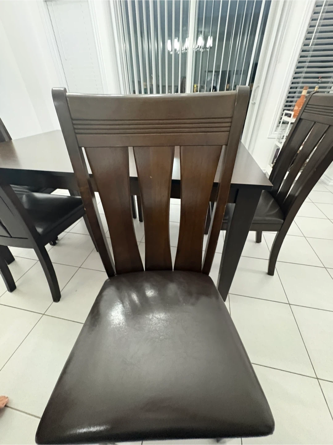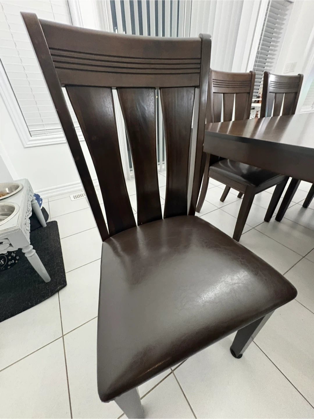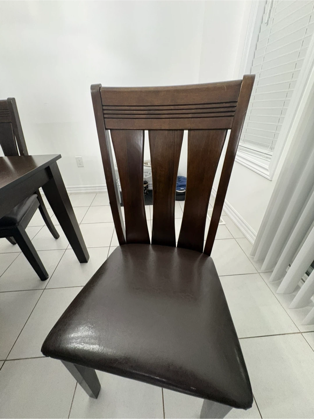 Selling table and a set of 6 dining room chairs. They're a dark brown colour with a leather-like seat. Great for completing your dining set! Has some scratches one deeper one on chair as shown on picture.