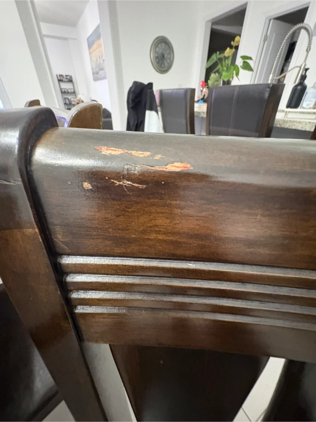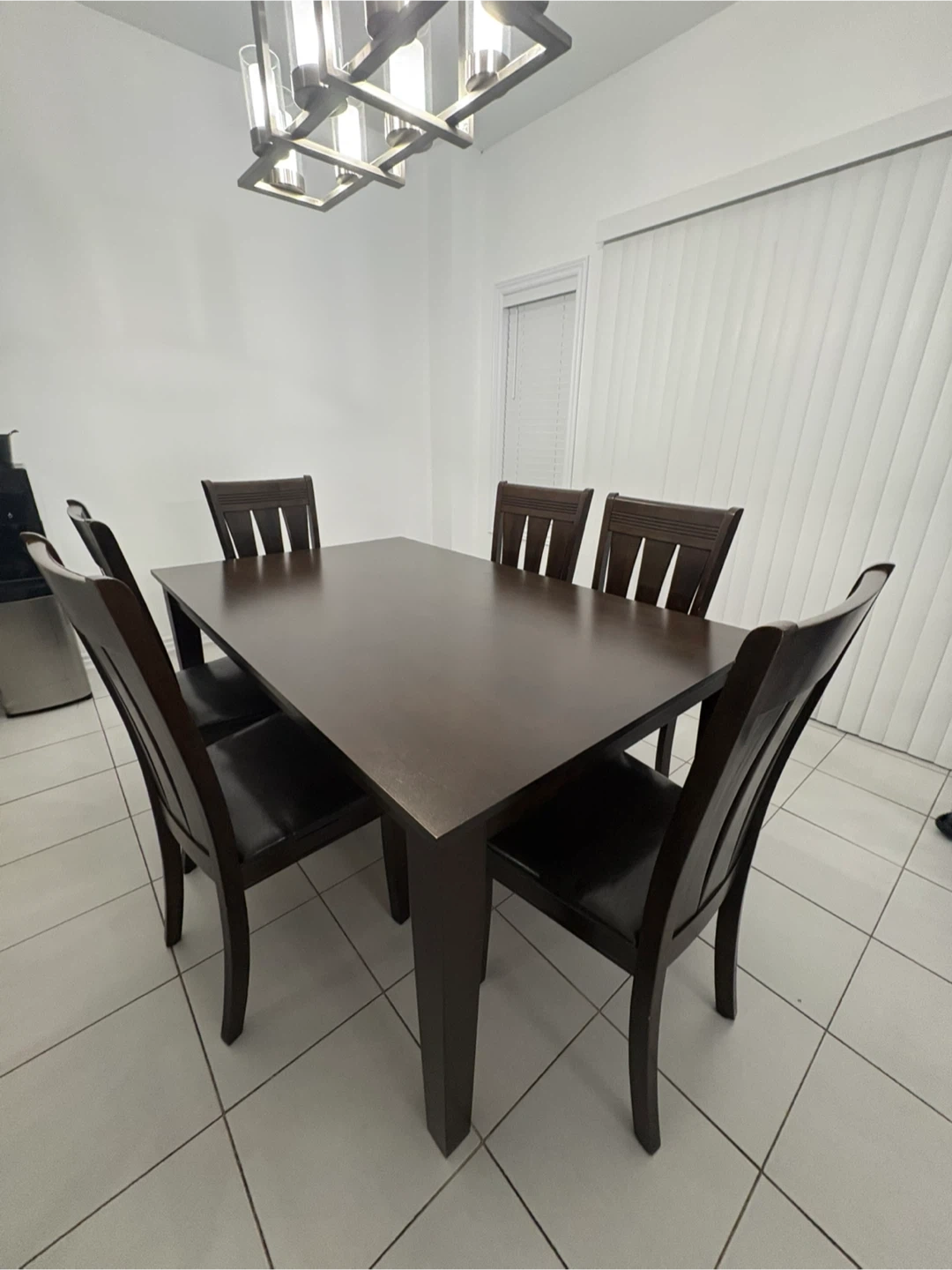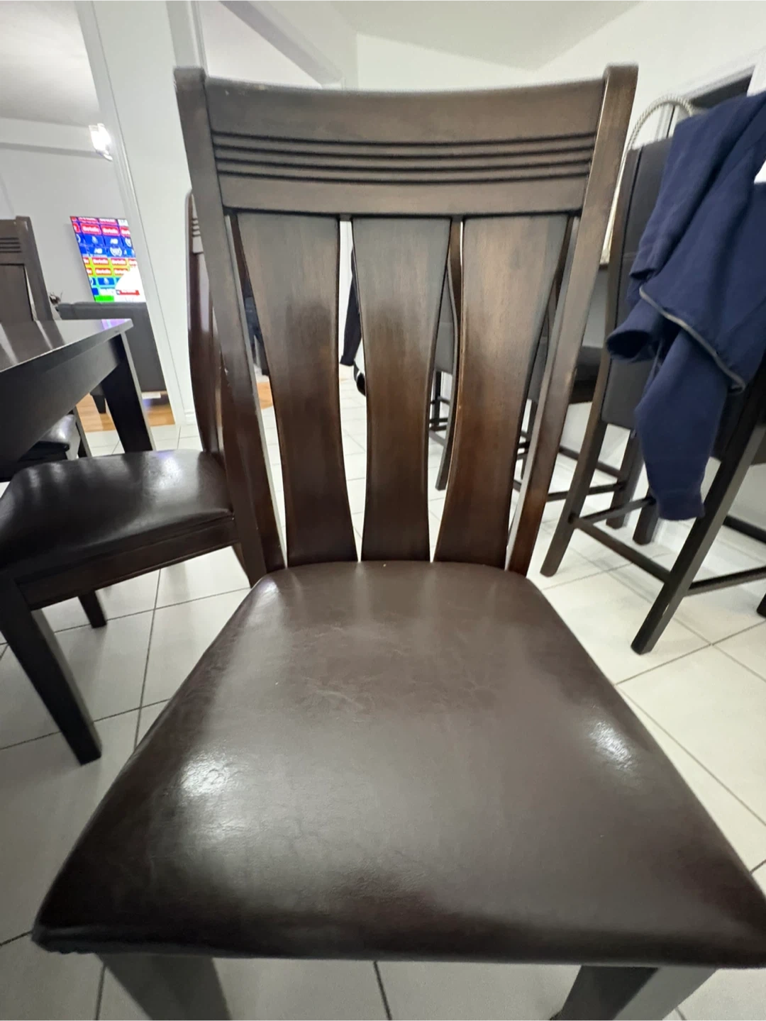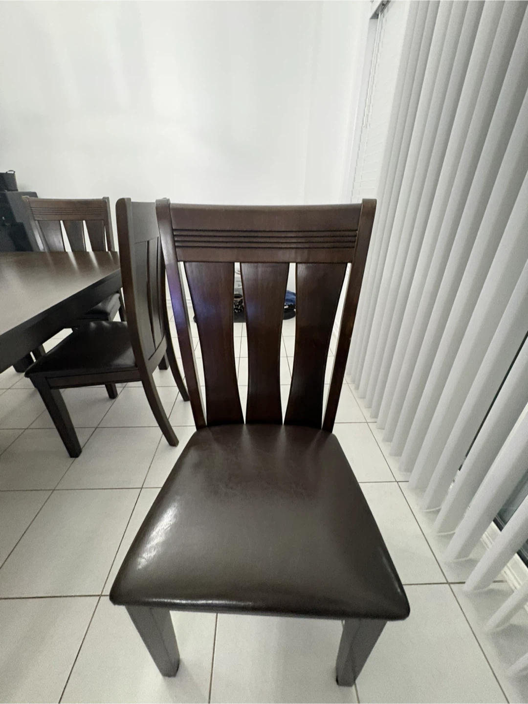 Selling table and a set of 6 dining room chairs. They're a dark brown colour with a leather-like seat. Great for completing your dining set! Has some scratches one deeper one on chair as shown on picture.