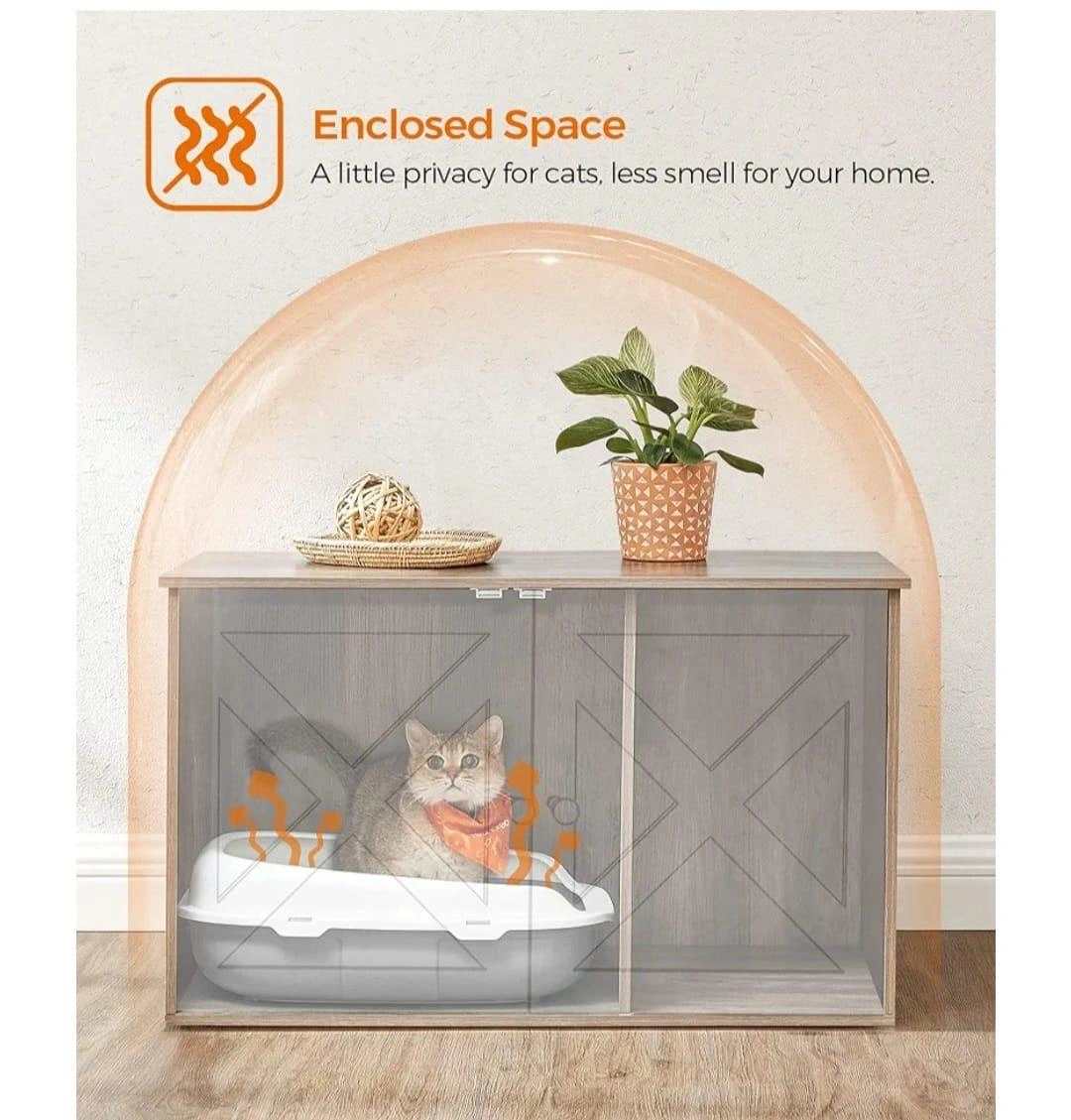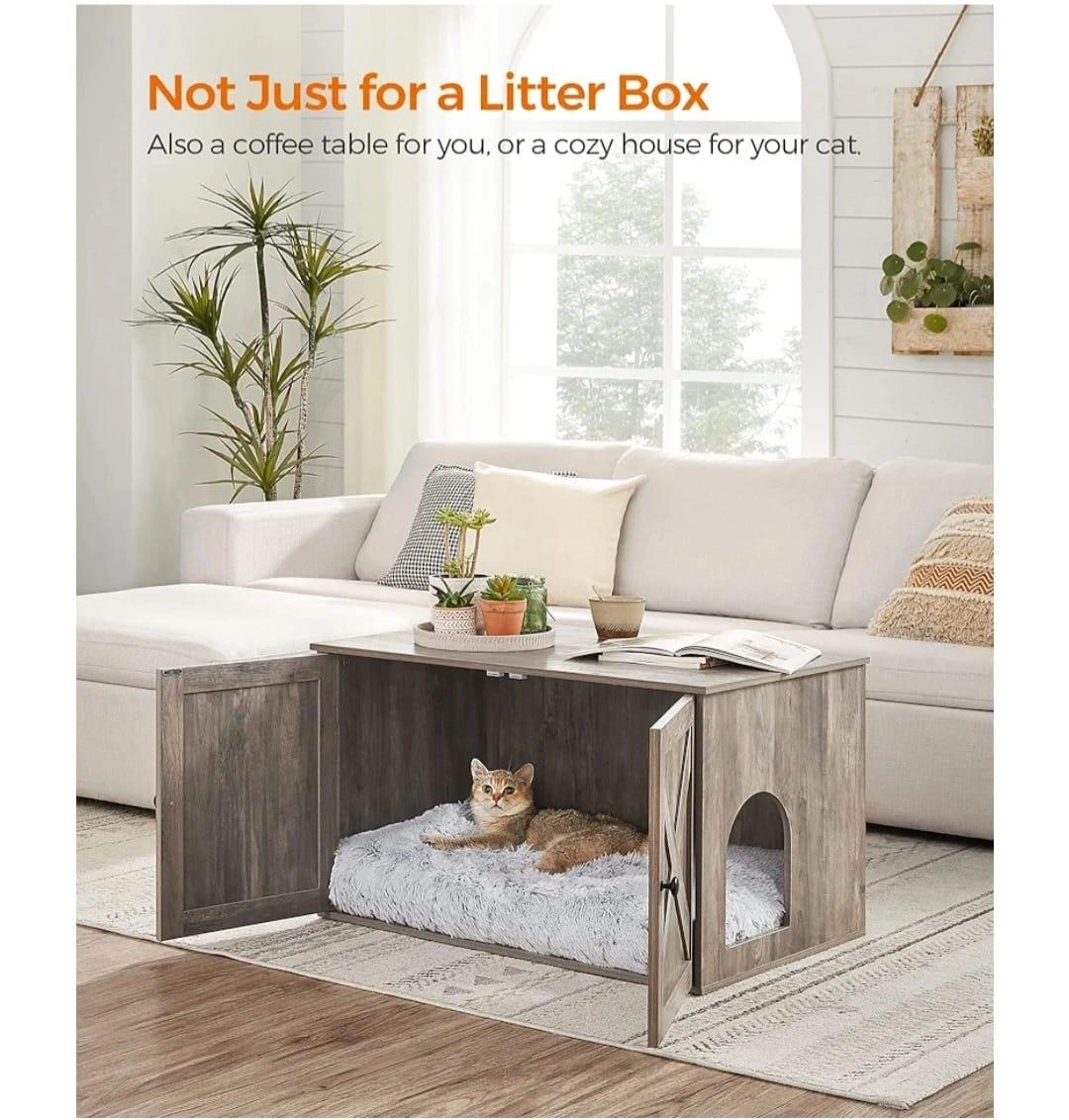 18This is a coffee table that doubles as a cat litter box enclosure! It's a great way to keep the litter box out of sight and give your cat a cozy place to do their business. It also works as a coffee table for you, or a cozy house for your cat. It features an enclosed space that gives a little privacy for cats and less smell for your home