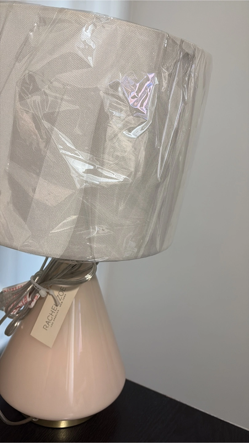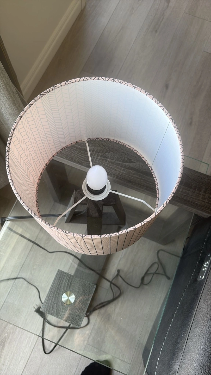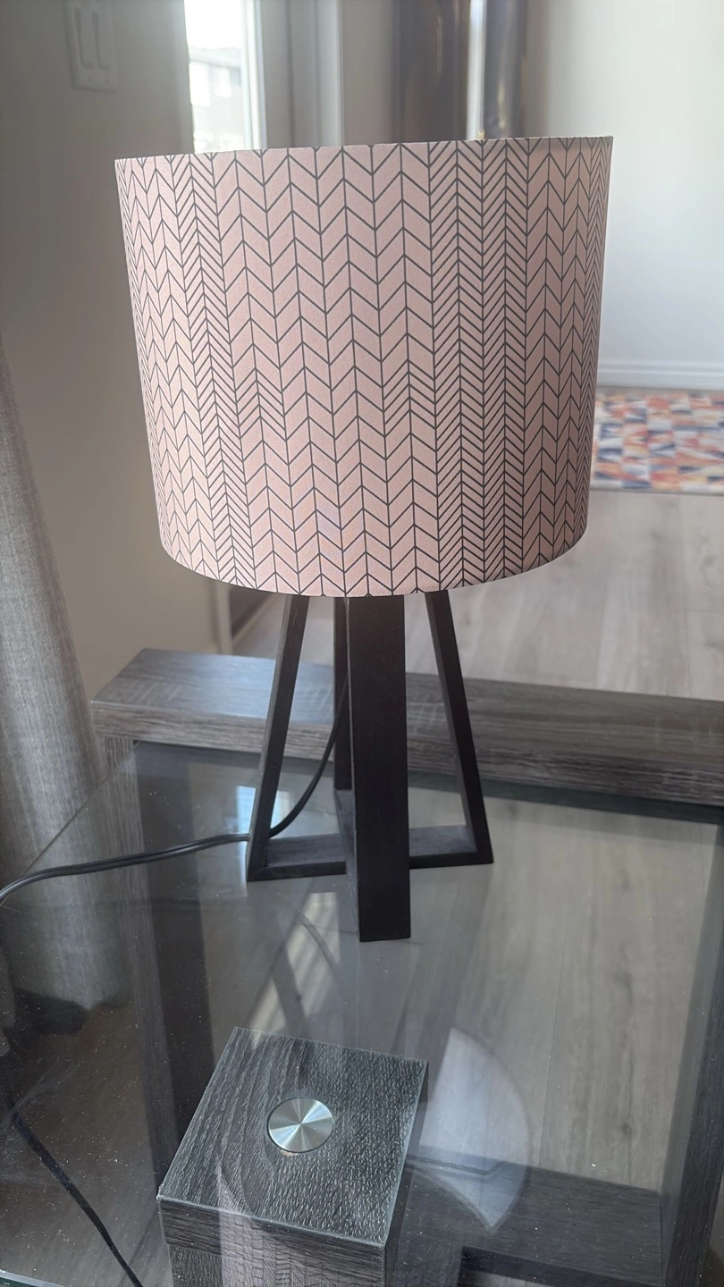 Table lamp with a geometric print lampshade. The base of the lamp is pink. The lamp is new and still wrapped, a perfect addition to create a soothing and comfortable space. Dm for price