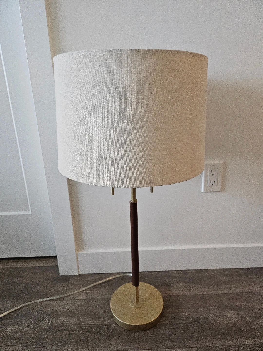 65Selling a stylish table lamp with a neutral beige shade and a sleek brown and gold base. It's in great condition and would look lovely in any living room or bedroom. It provides a nice, warm light.