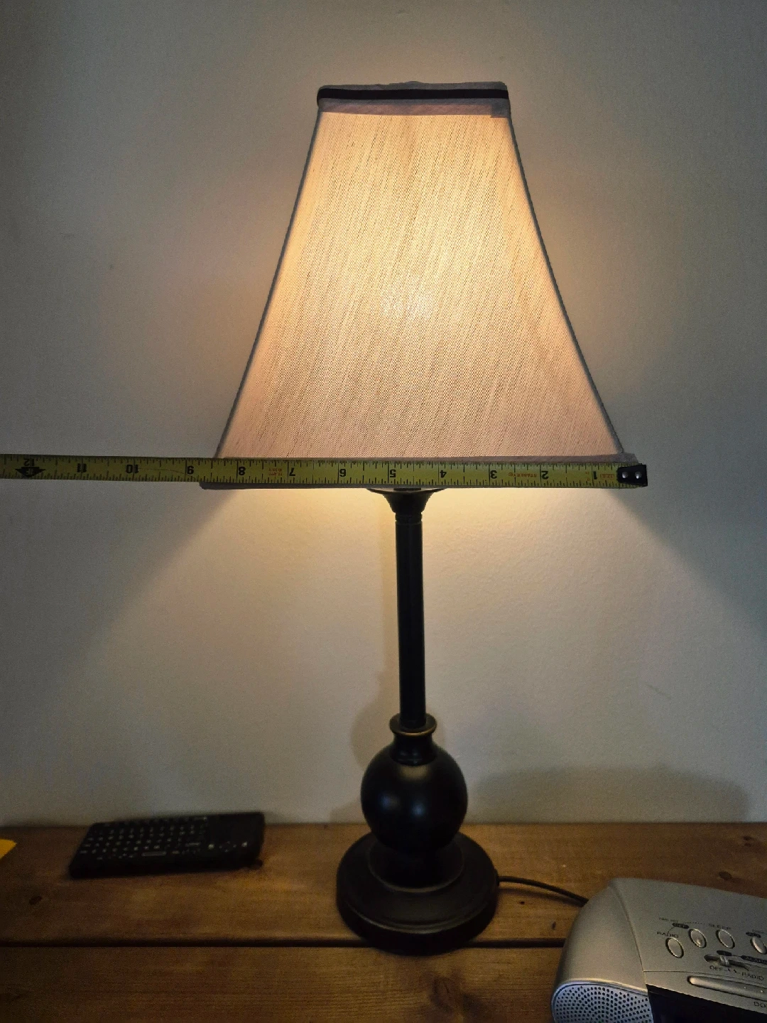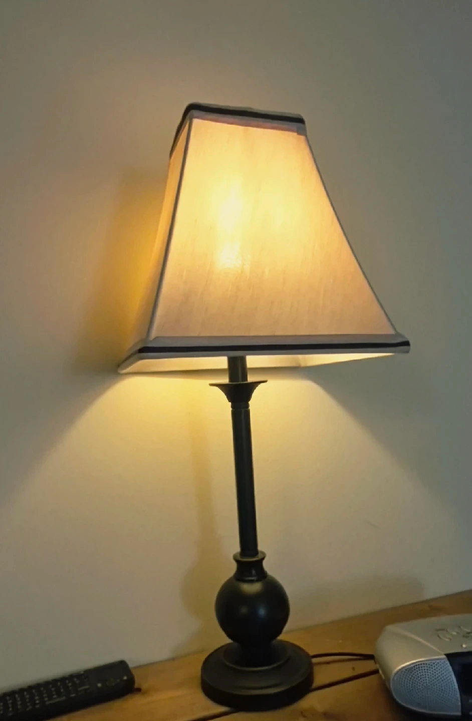 244Selling a table lamp with a black base and a beige shade. It stands approximately 20 inches tall. Perfect for adding a warm glow to any room at any given time.