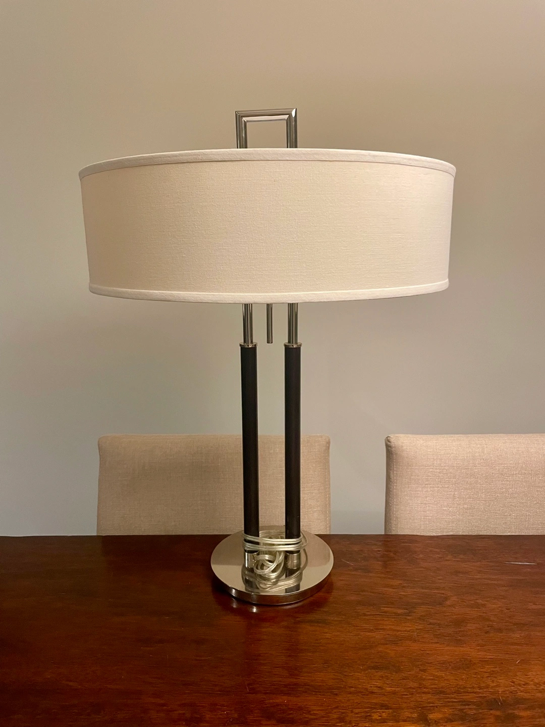 Table lamp with a cream drum shade and black & silver base. Silver pull-chain for tri-light setting (2 light bulbs). Originally bought at ELTE for $700. Note - requires a new pull-chain mechanism, but does work on a light switch plug when you get it to the right setting. Sold AS-IS.