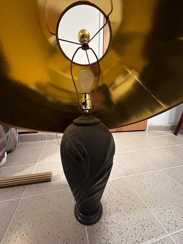 44Illuminate your space with this eye-catching table lamp, featuring a unique carved design on its base and a sleek black shade. This lamp is used, adding a touch of vintage charm to any room. It provides a warm and inviting glow, perfect for creating a cozy atmosphere. I estimate that similar lamps sell for around $30-$60. If the ad's up, it's up for grabs! Cash only