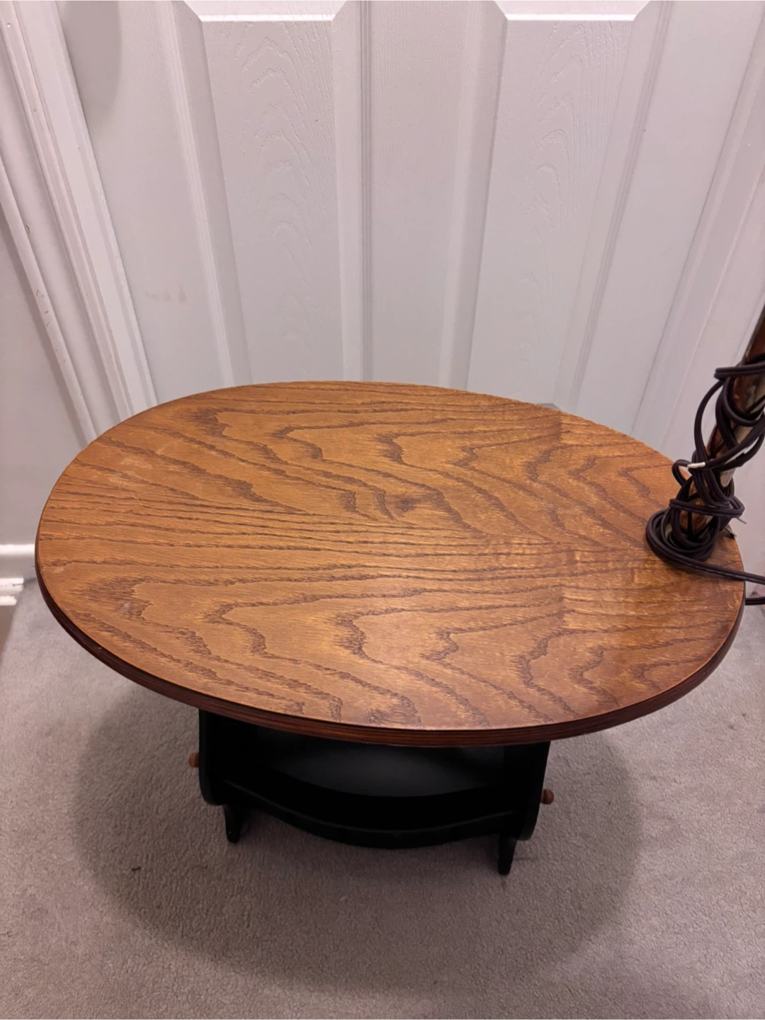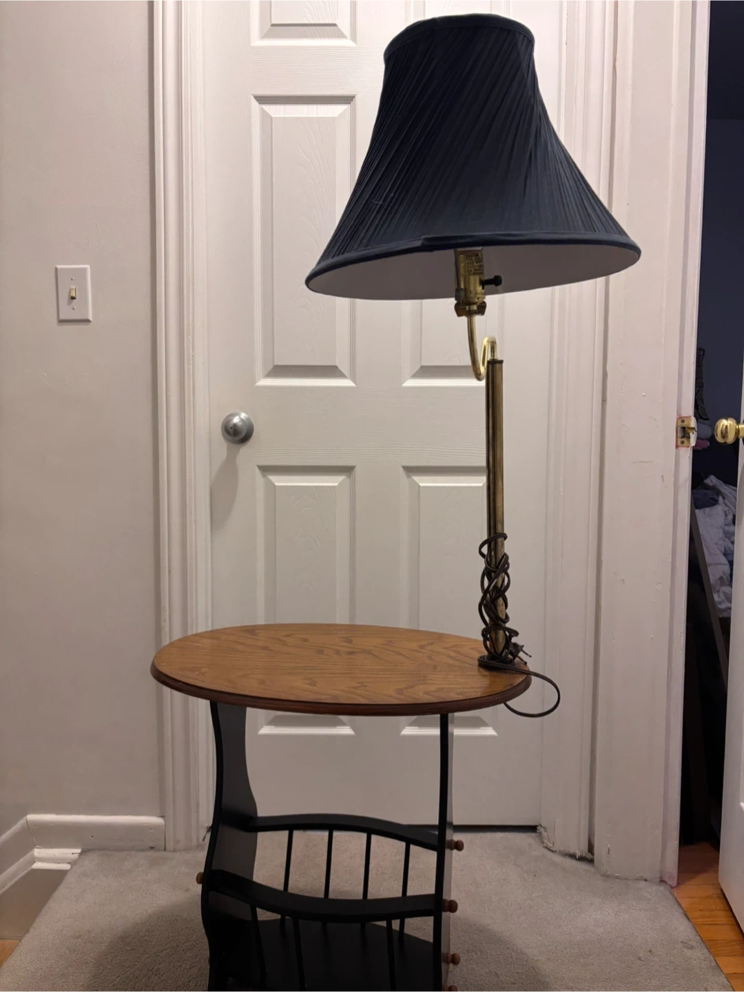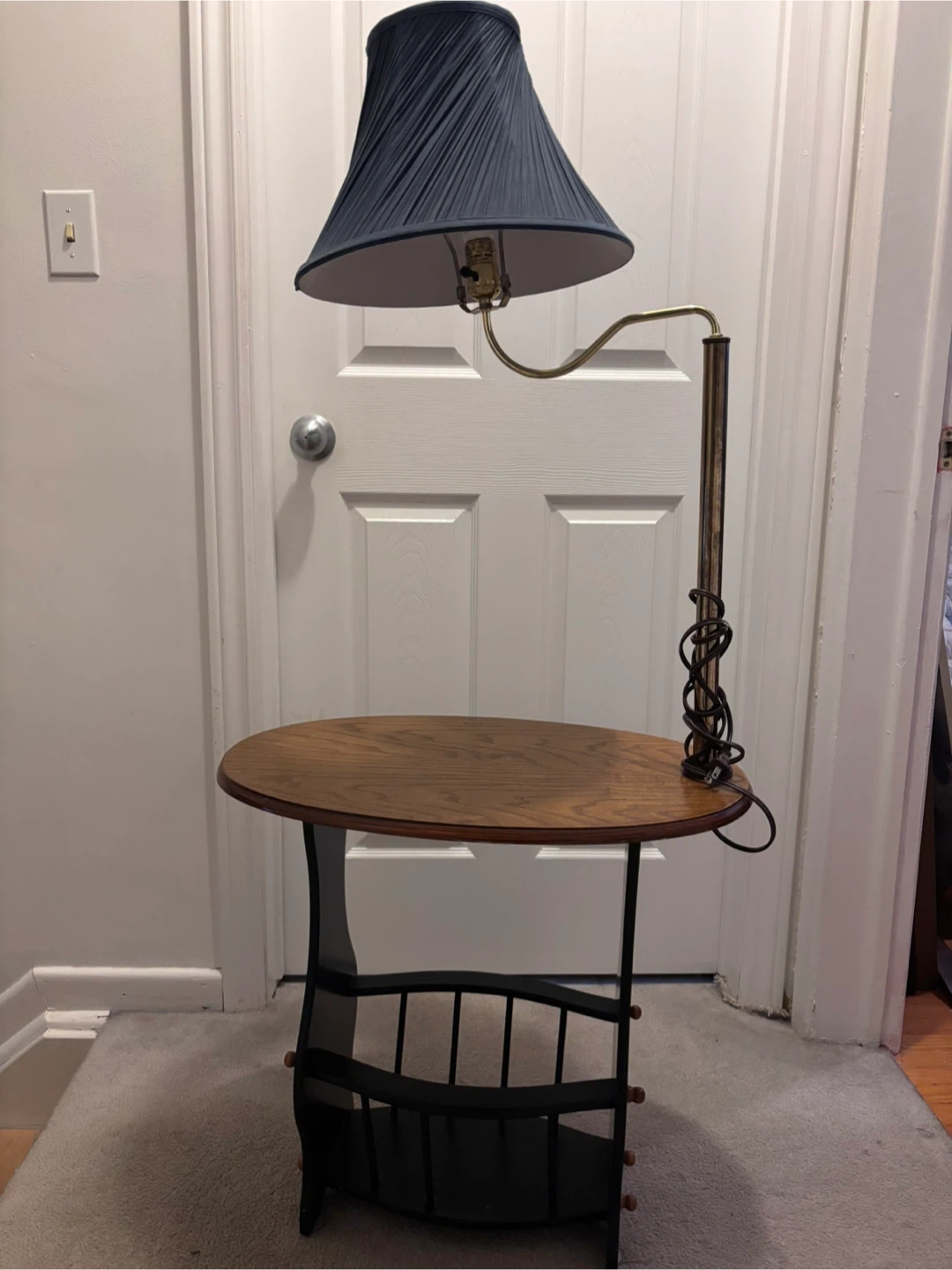 31"Multifunctional Mastery! This ingenious side table combines a magazine/book rack, wooden table, and lamp all in one, perfect for bedrooms or living rooms. Plus, the lamp shade is easily interchangeable to match your unique decor style!" P.S. missing is one spool for the rack