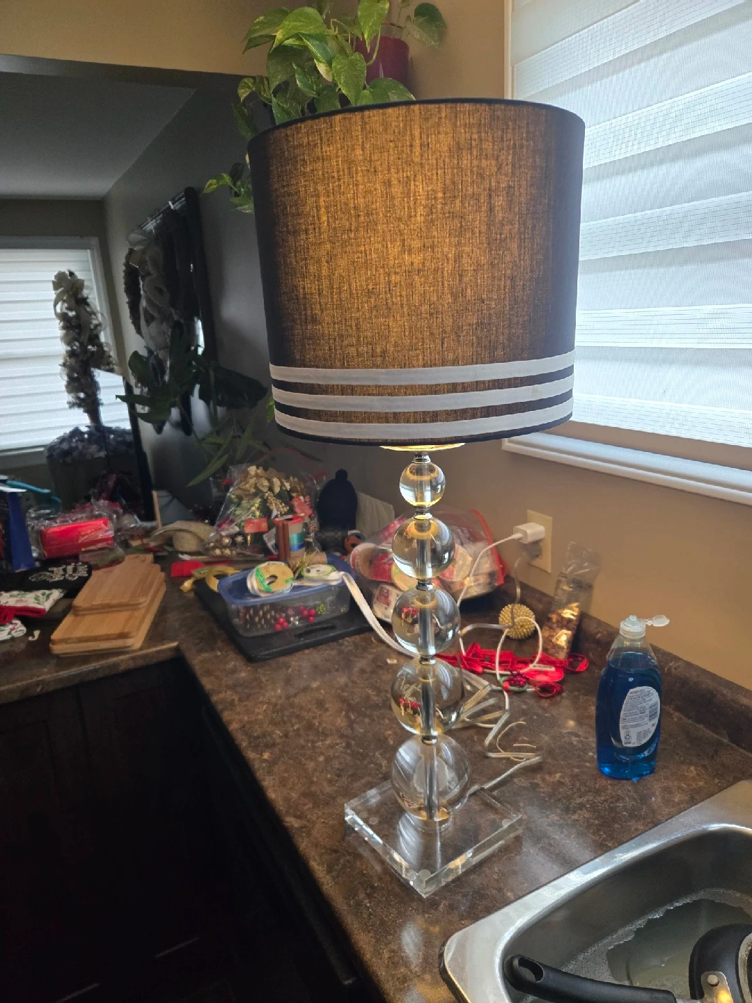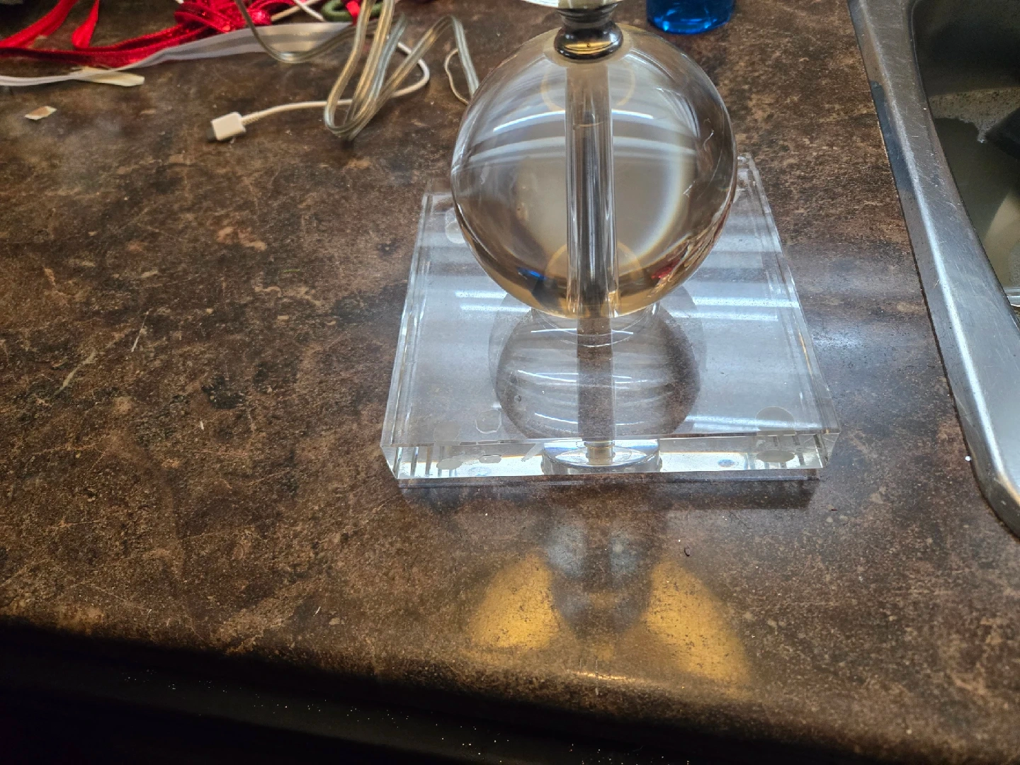 21Add a touch of modern elegance to your space with this table lamp, featuring a clear sphere design and a stylish shade; this lamp is in good condition and ready to brighten up your home. Could use a new lamp shade. * Clear sphere base * Stylish shade Looking to light up your life? Well, you're in luck! If the ad is up, the lamp is available