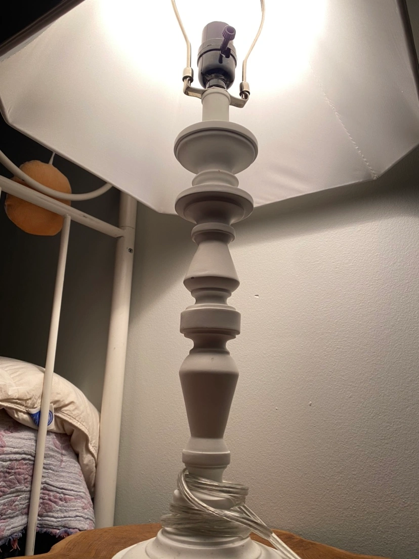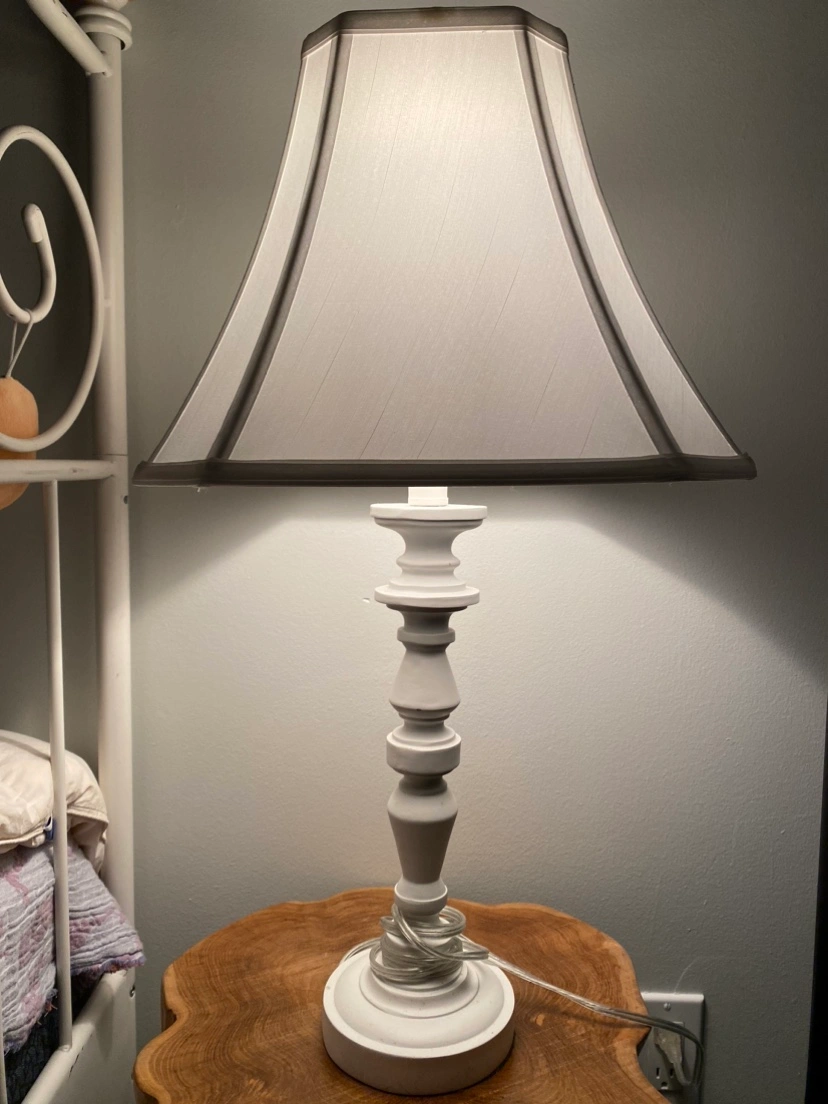 65The perfect lamp for any side table! Made with a wooden base painted white, and topped off with a white cotton lampshade. No marks or imperfections on the lampshade. White base has minor marks on it, as per the pictures- but they’re barely noticeable. I can do public meetup, pick-up from my home, or potentially drop-off ($5 extra). Cash only! Thank you 😊
