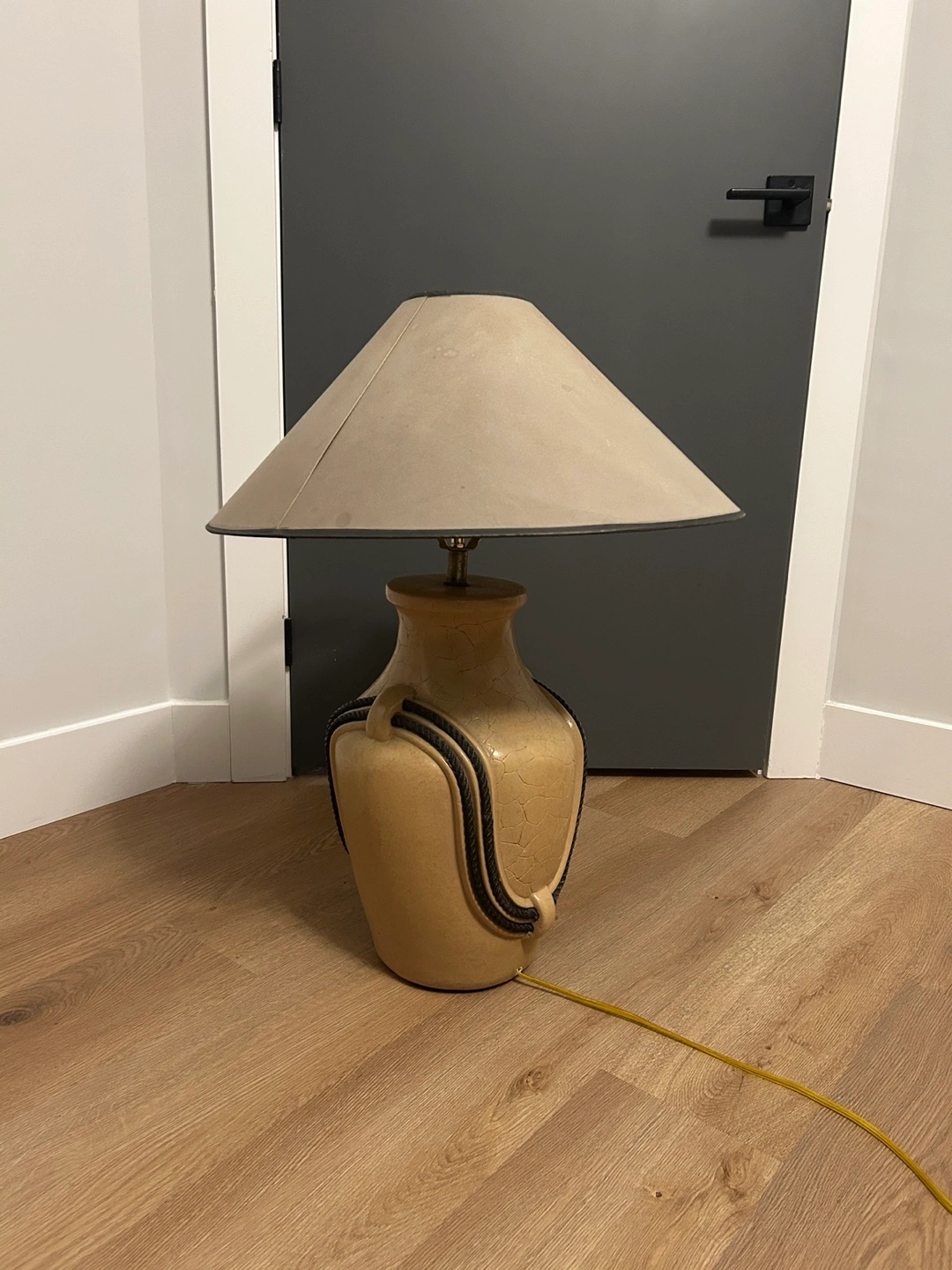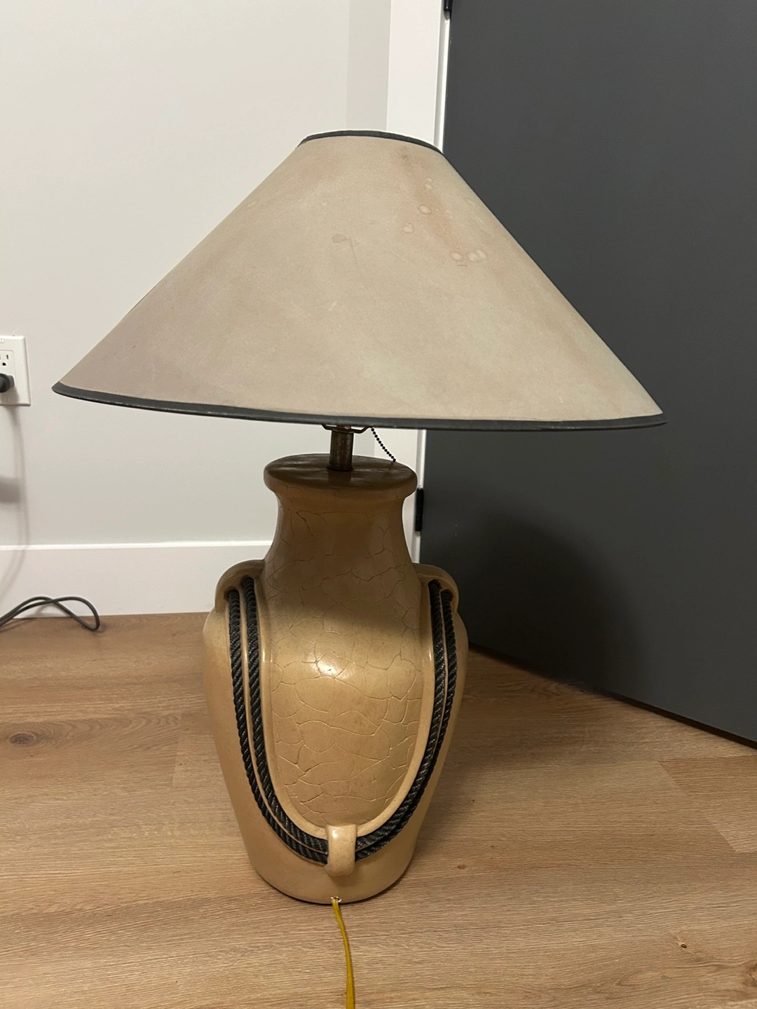 10Beautiful table lamp, beige craquelure finish, dark accents. Conical lampshade. Great addition to any room. Pre-owned. Might need to change lamp change.