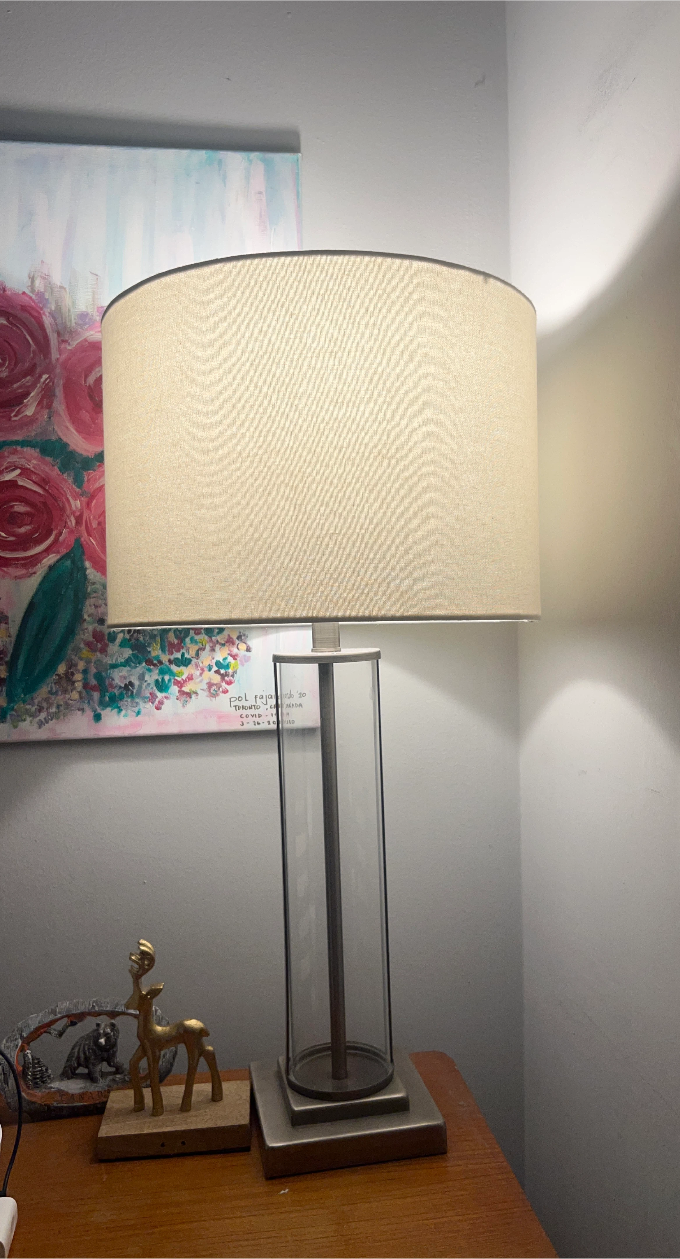 đŸ¤—Selling a table lamp with a beige shade. It has a modern design with a clear, rectangular base. It would look great in a living room or bedroom! 2 items.