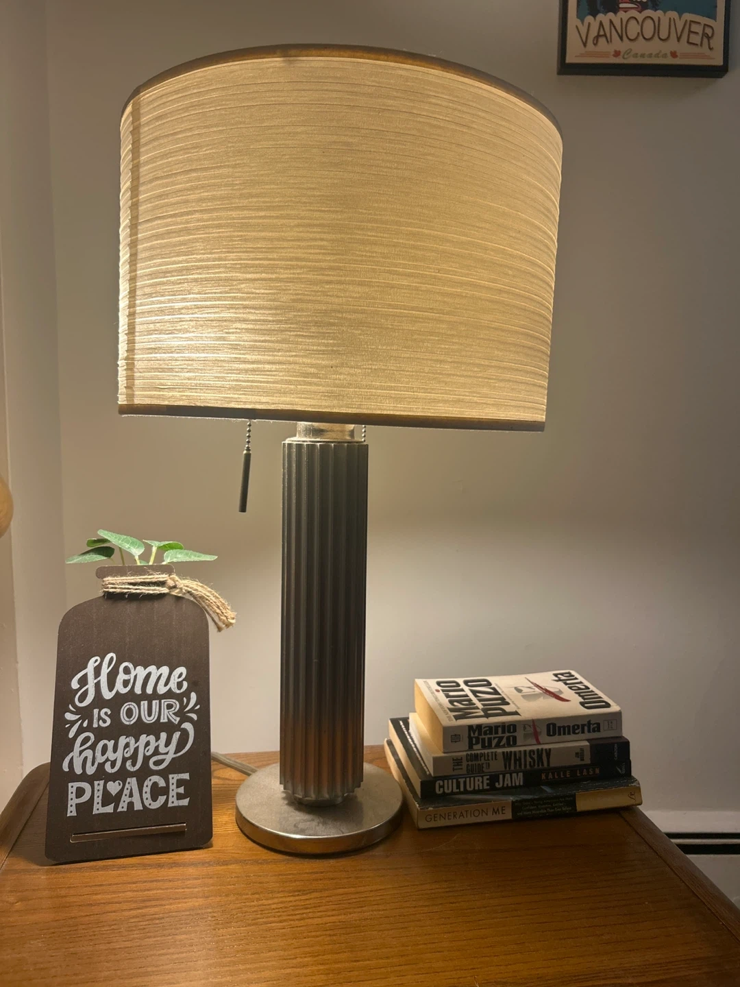 15Selling a table lamp with a beige shade. It's in great condition and would be perfect for a bedside table or desk. The lamp has a pull chain switch and a simple, elegant design that will fit in with any decor
