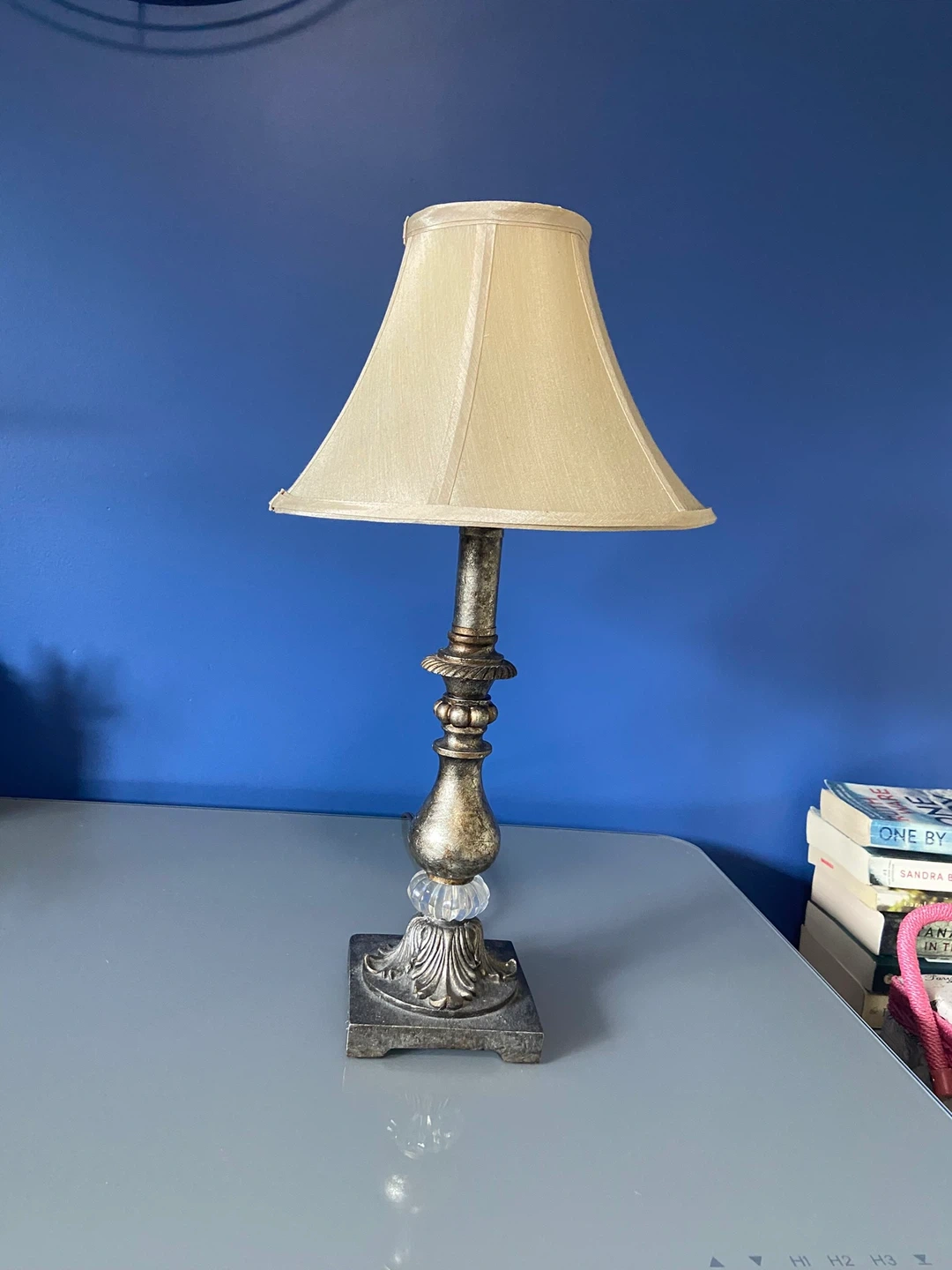 10A charming table lamp with a beige shade, perfect for adding a touch of warmth to any room! The base features a decorative design with a crystal-like accent, giving it an elegant look. It's in great condition and ready to brighten up your space