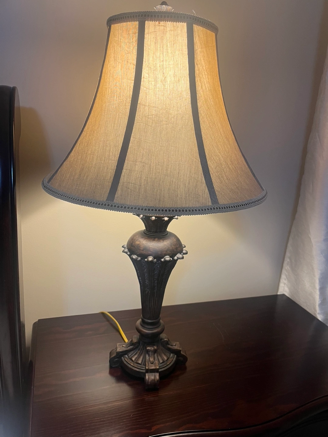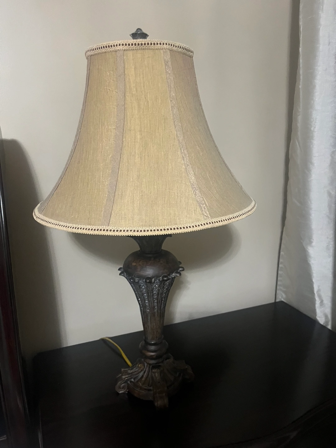 Selling a lovely table lamp that would look great in any room! It features a beige shade and a decorative base. The lamp is in good condition and provides a warm, ambient light