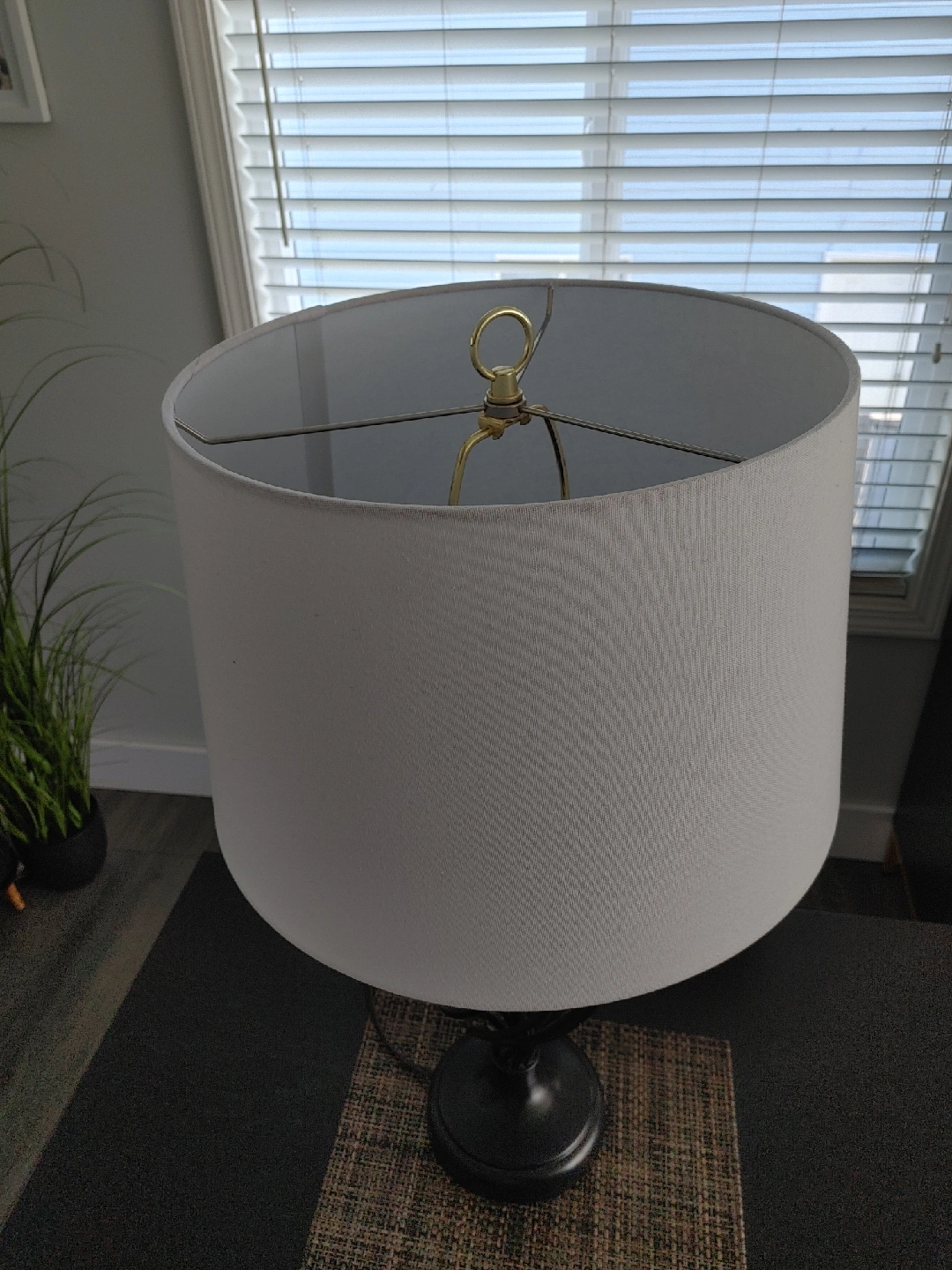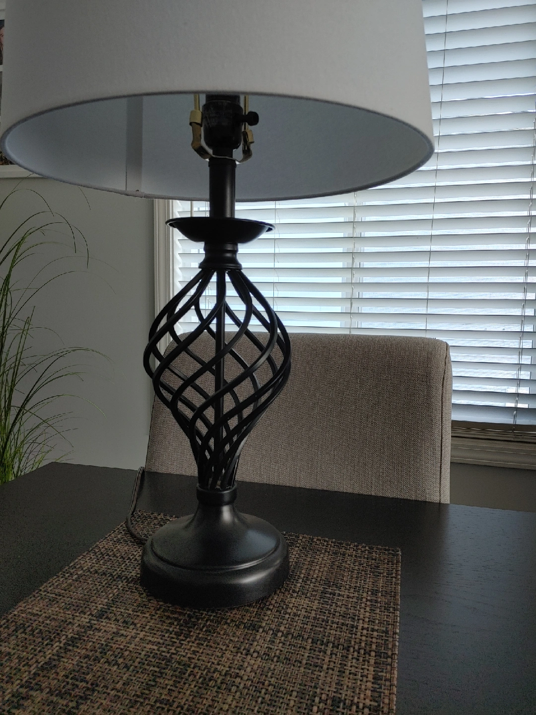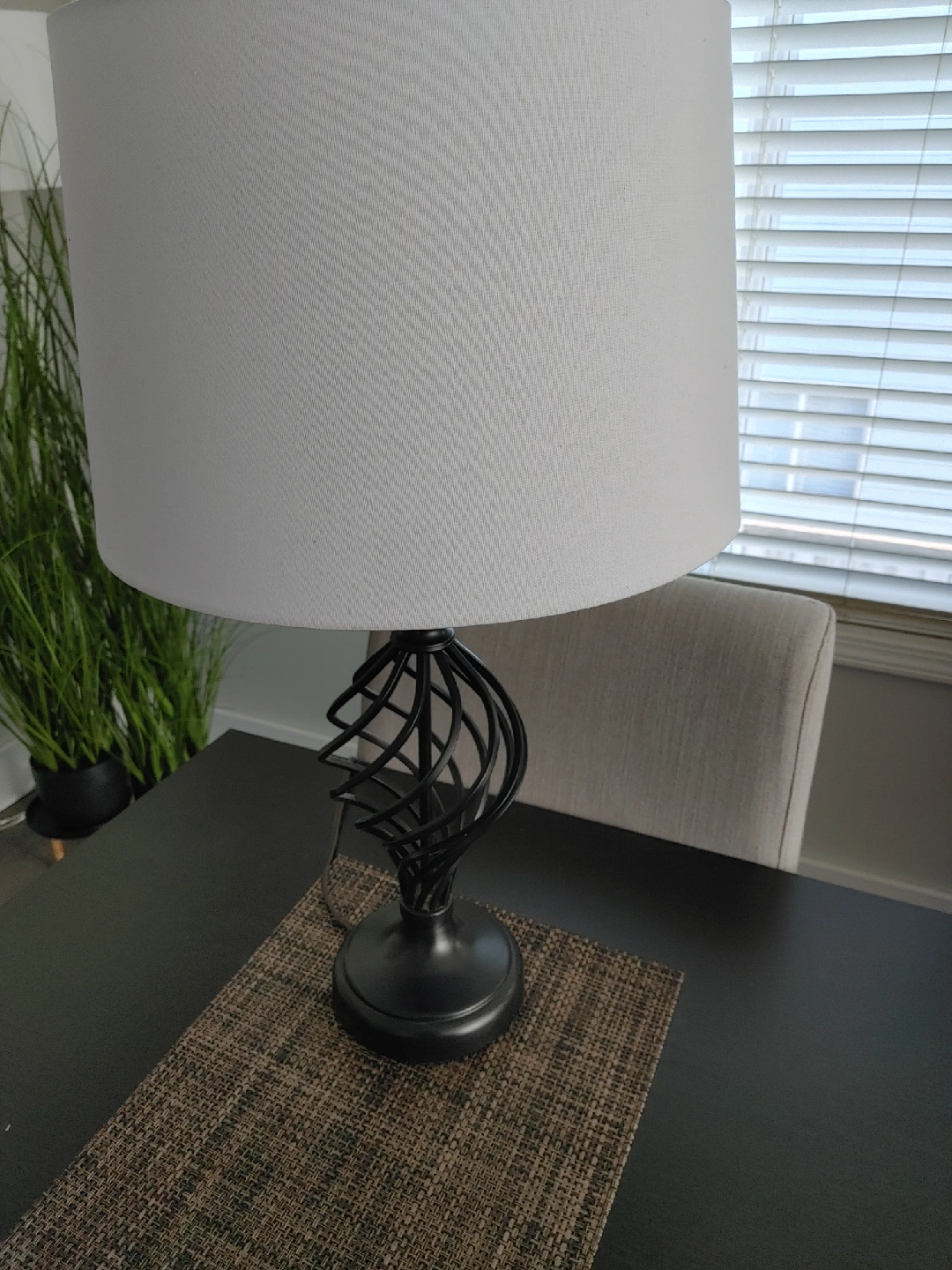70Selling a table lamp with a unique black twisted metal base and a white lampshade. It's in great shape and would look lovely in any room!