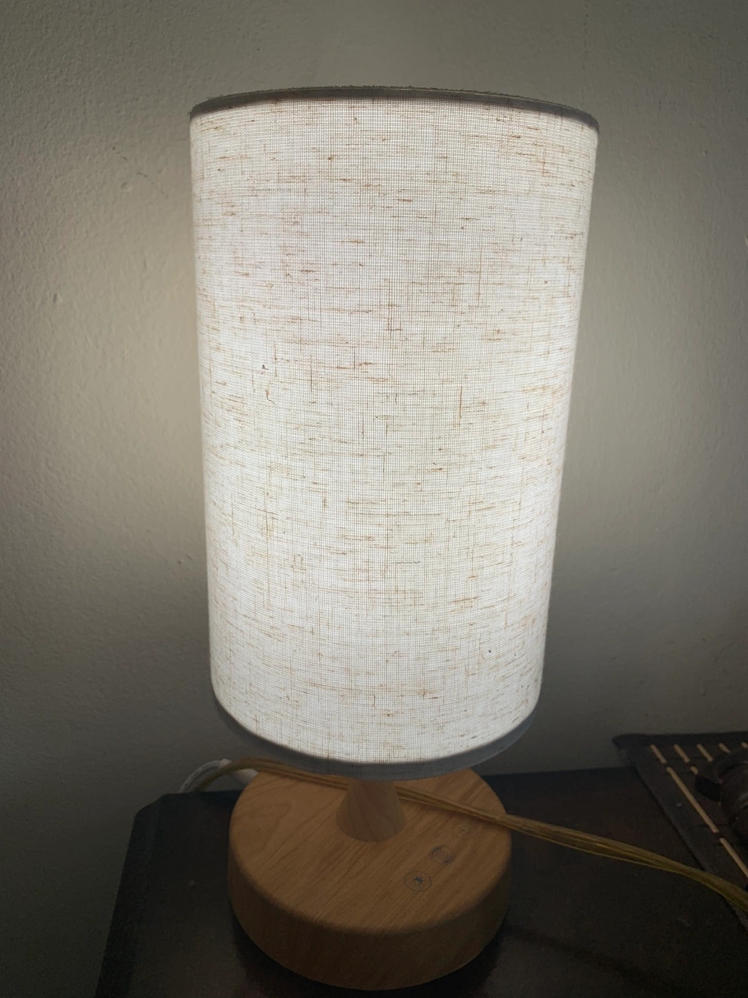 Selling a cute table lamp! It features a natural wood base and a linen shade, perfect for adding a warm glow to any room