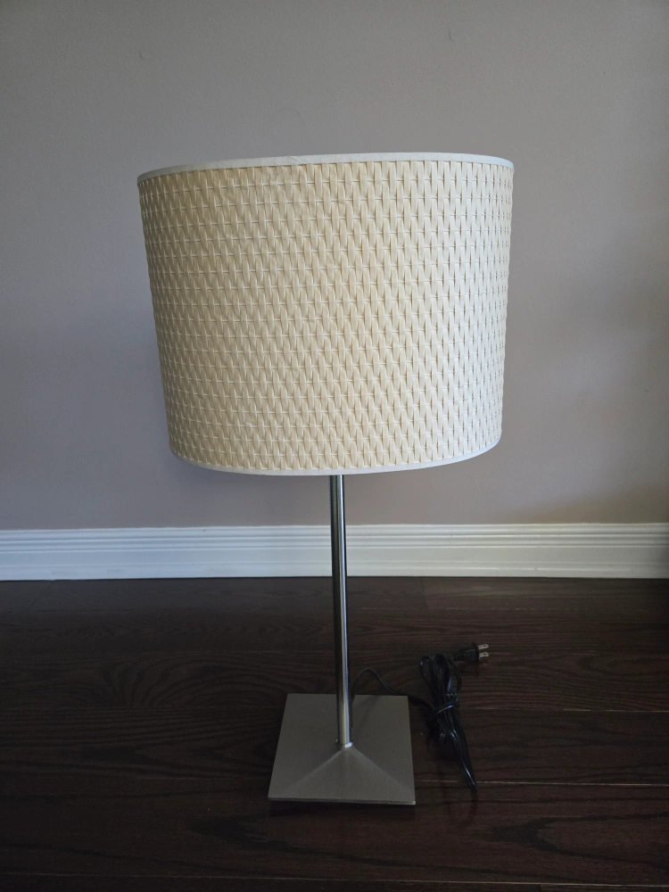 Table Lamp with oval shade! Sleek, modern design with a square metal base. Light Beige color. 24" tall, 12"wide Pick up from Richmond Hill. Cash only.