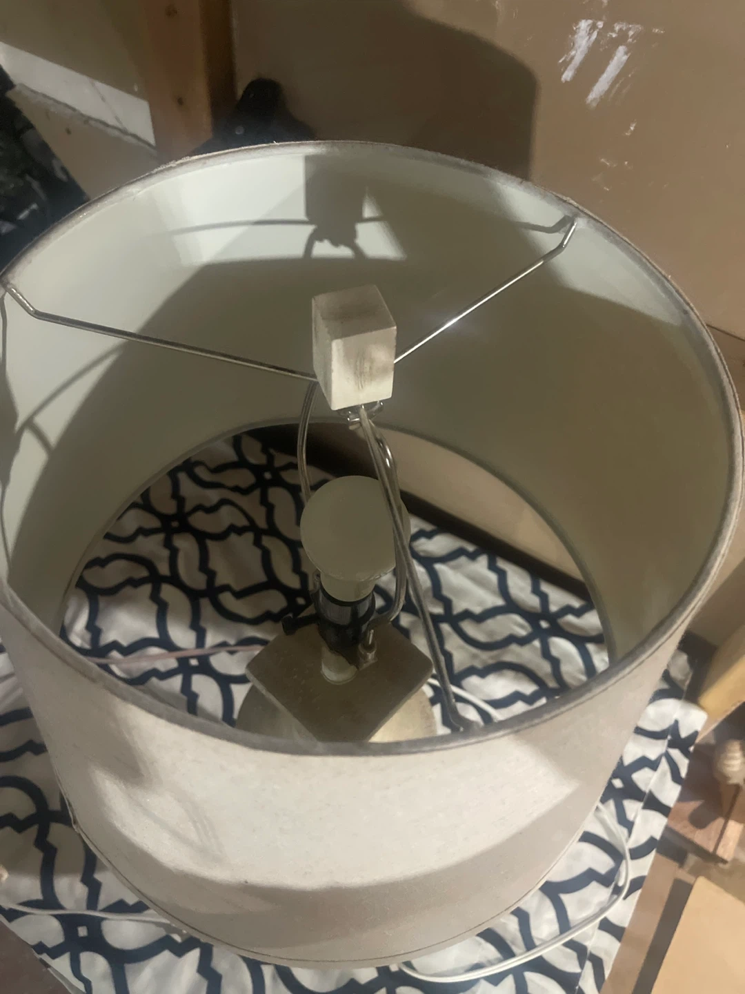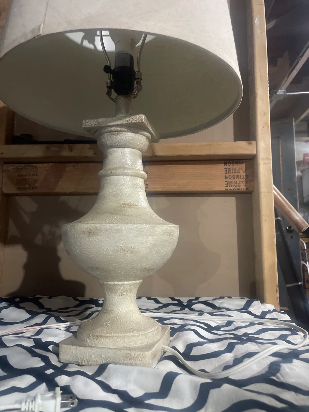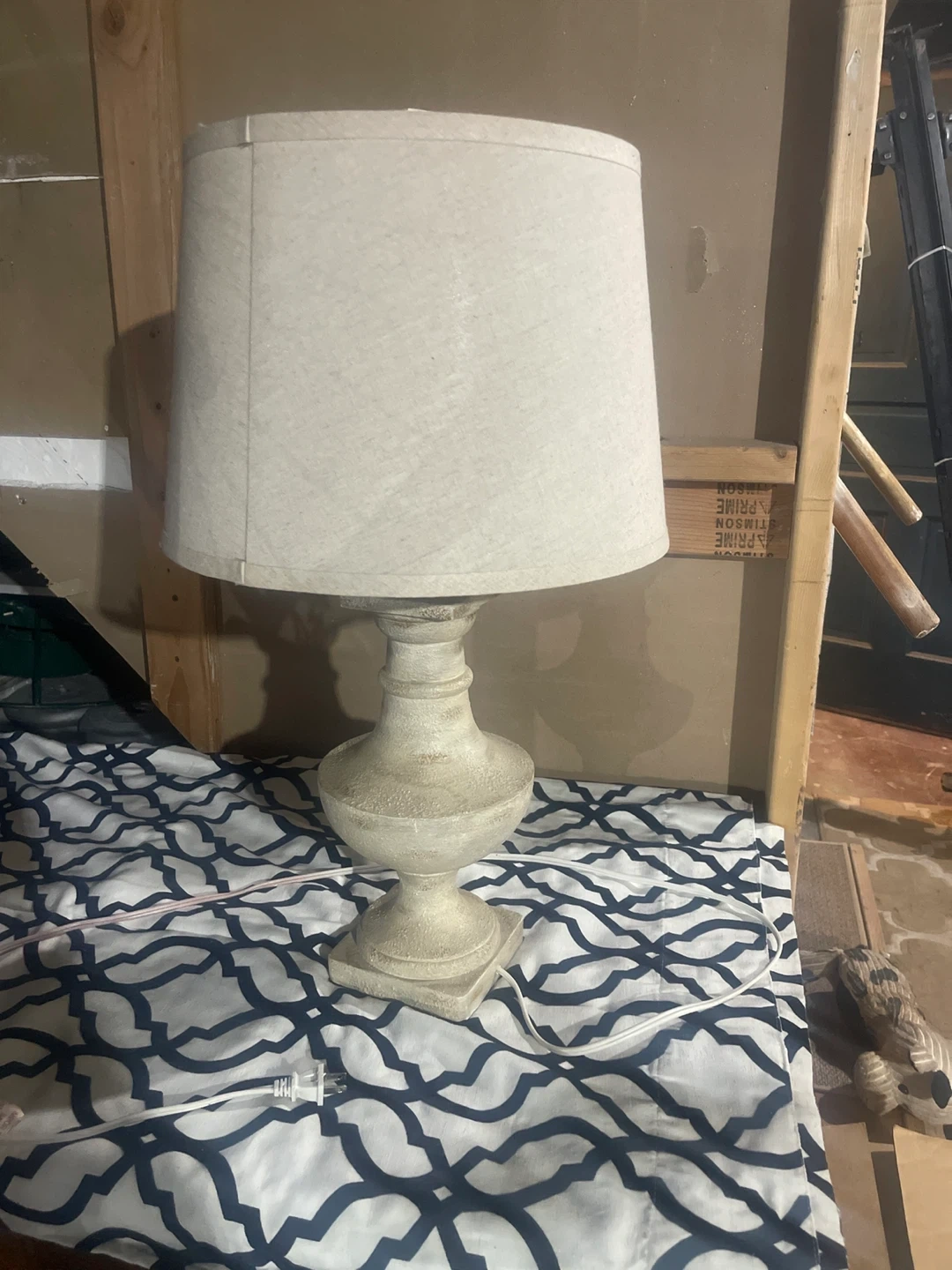 Selling a table lamp with a neutral-colored shade. It has a classic design that would fit well in any room. The lamp is in good condition and provides a warm, ambient light. Perfect for a bedside table or living room accent!
