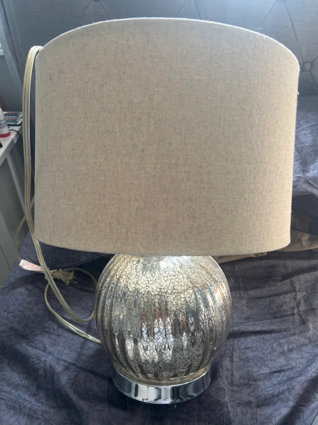 71Selling a table lamp with a unique silver-coloured base and a neutral lampshade. It's in great condition and would look lovely in any room!
