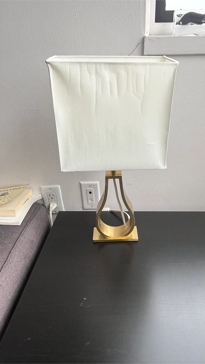 18Selling a table lamp with a white rectangular shade and a gold-coloured base. It's in great condition and would look lovely on a bedside table or desk. The base has a unique, modern design that adds a touch of elegance to any room