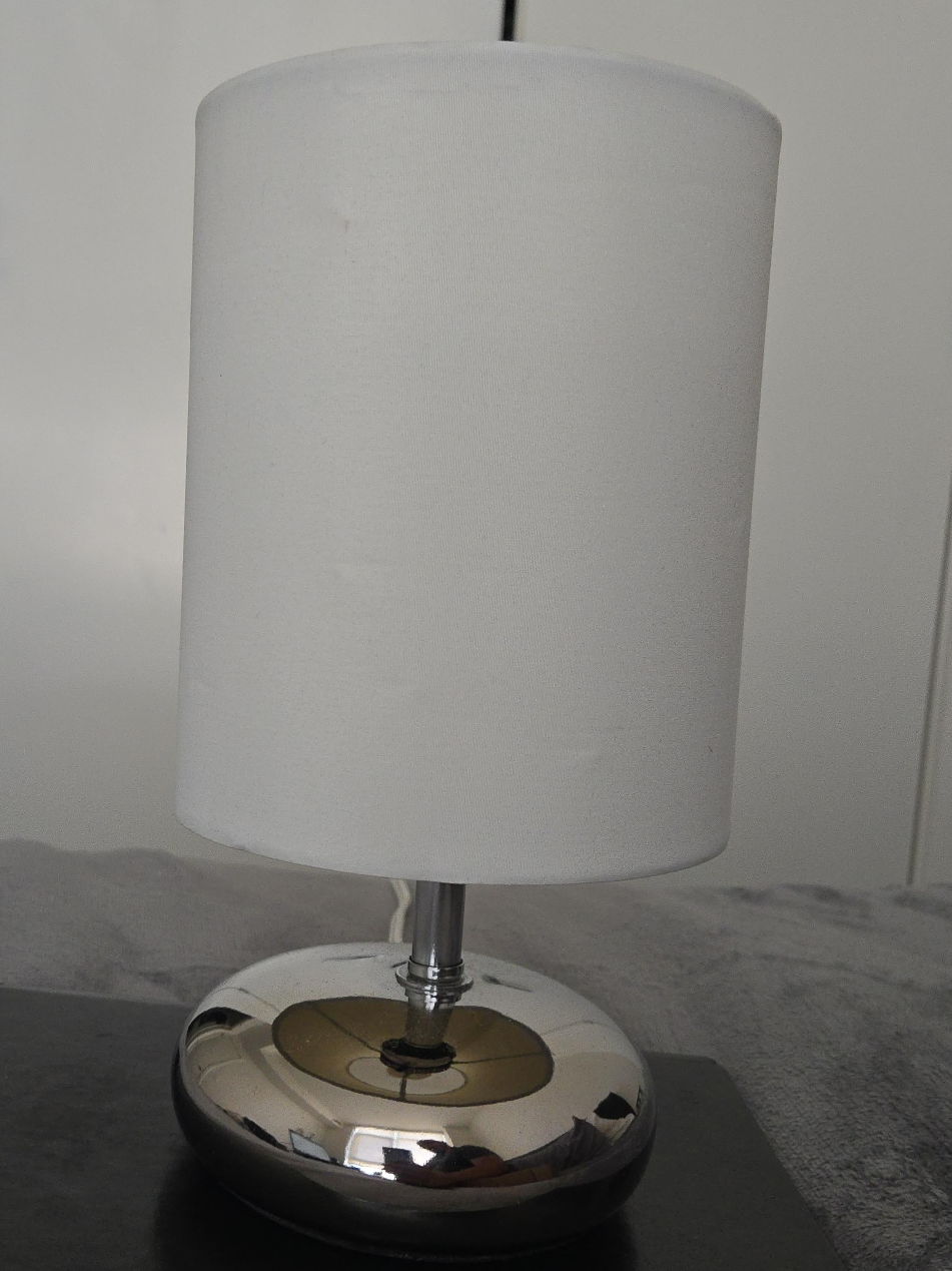 Selling a table lamp with a white fabric shade and a chrome-coloured base. It's in great shape and would look lovely in any room!