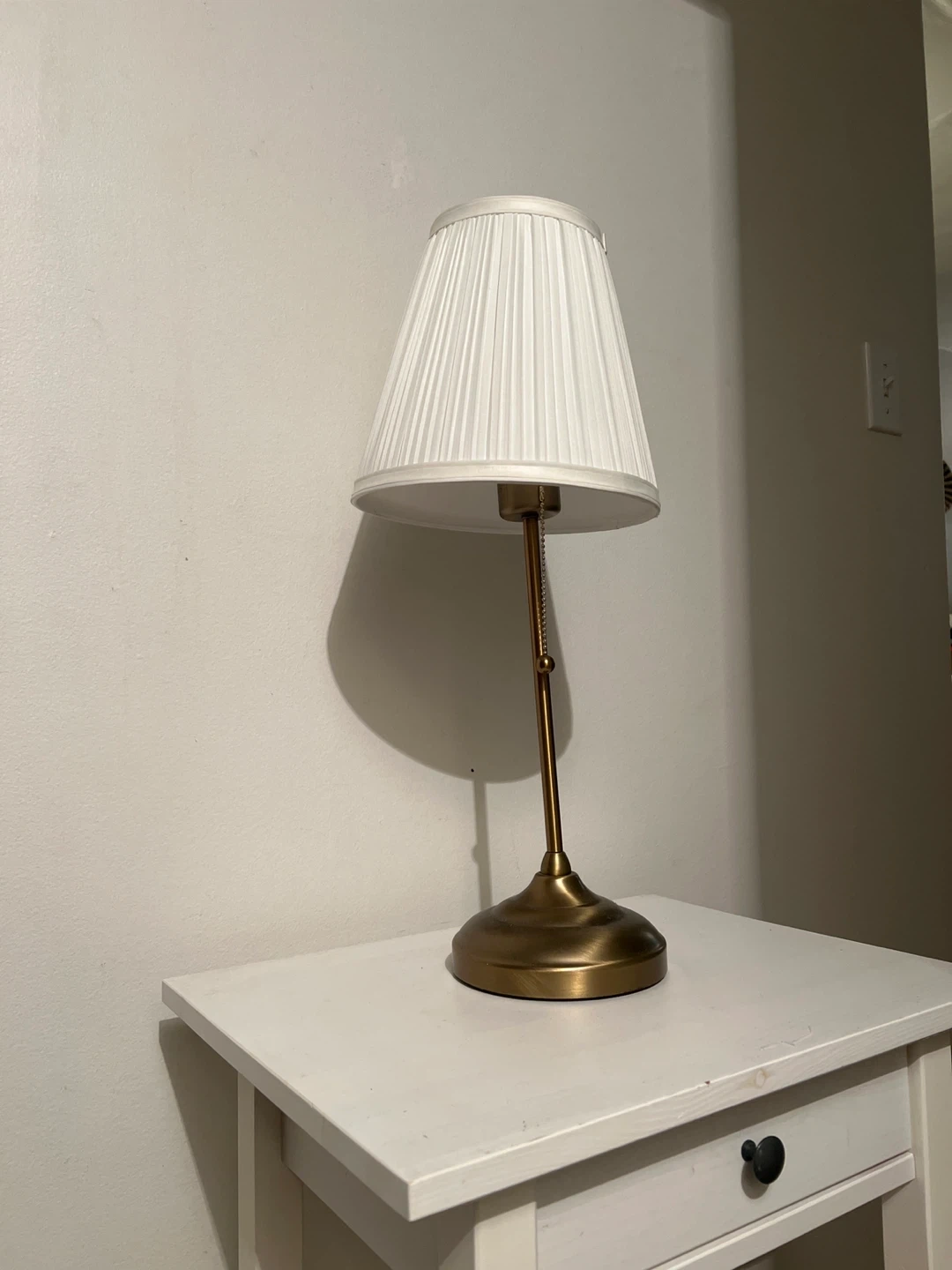 Selling a table lamp with a white pleated shade. It has a brass-coloured base and a slender adjustable arm. Perfect for a bedside table or desk!