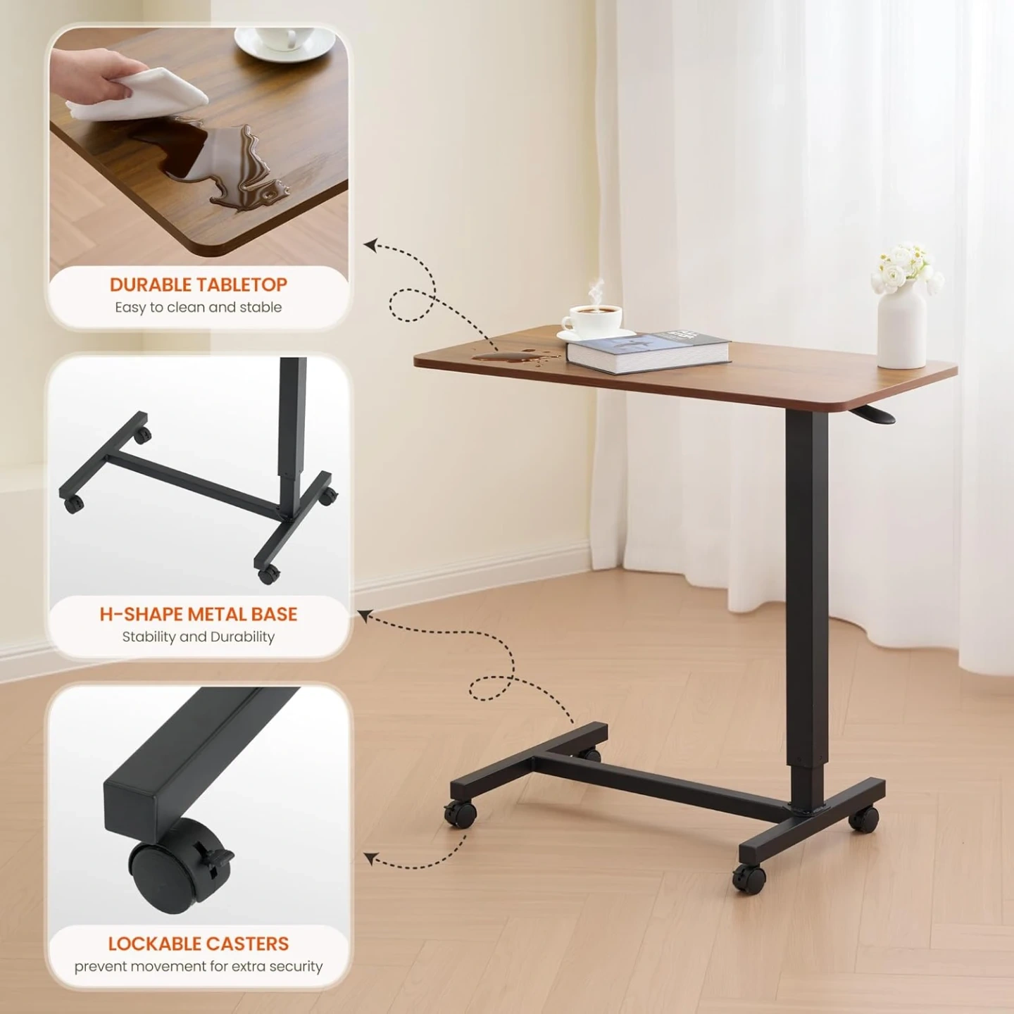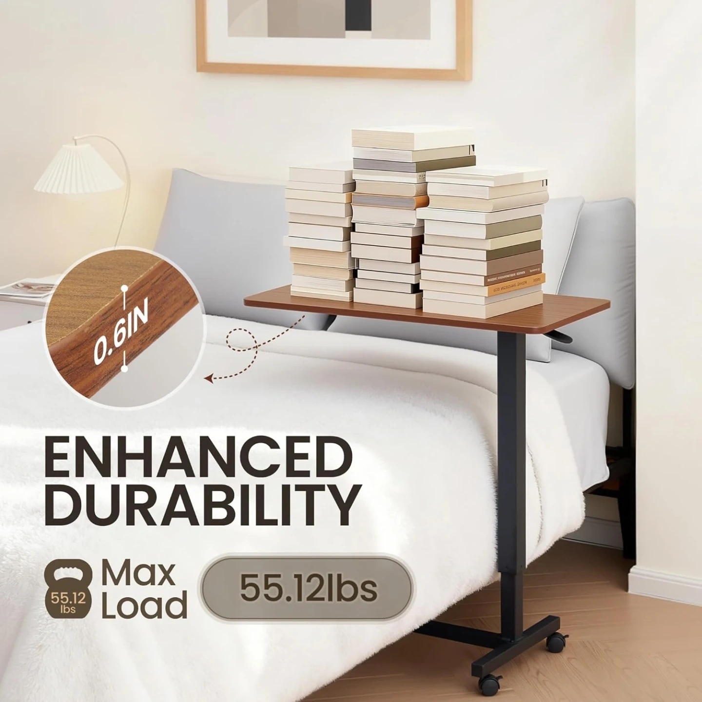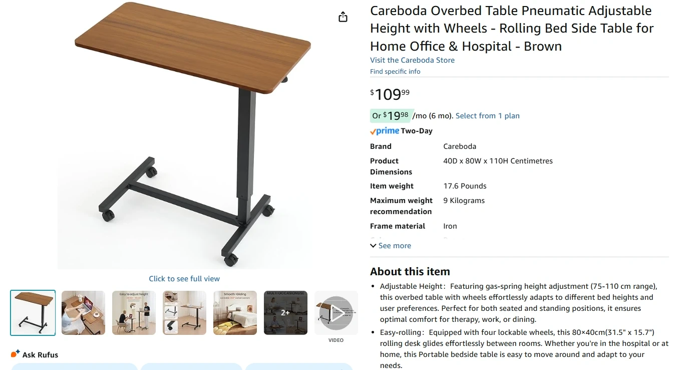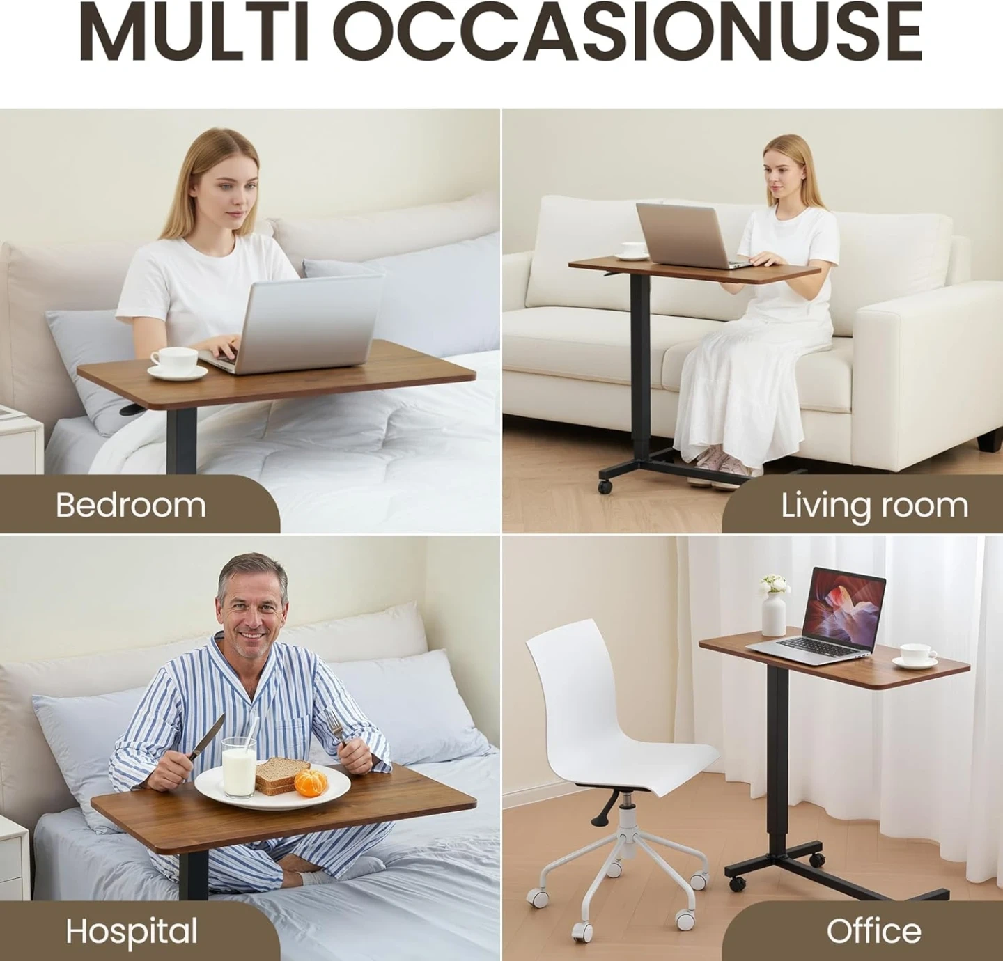754Overbed Table Pneumatic Adjustable Height with Wheels - Rolling Bed Side Table for Home Office & Hospital - Brown, Brand New in the Box/Sealed Sells for $110+tax on Amazon https://www.amazon.ca/dp/B0FG72FCZ1 Features: Adjustable Height:Featuring gas-spring height adjustment (75-110 cm range), this overbed table with wheels effortlessly adapts to different bed heights and user preferences. Perfect for both seated and standing positions, it ensures optimal comfort for therapy, work, or dining. Easy-rolling:Equipped with four lockable wheels, this 80×40cm(31.5" x 15.7") rolling desk glides effortlessly between rooms. Whether you're in the hospital or at home, this Portable bedside table is easy to move around and adapt to your needs. Easy Assembly:Includes all necessary assembly tools for easy setup. Our bedside table supports up to 25kg (55 lbs) with a rustic brown finish that blends aesthetic appeal with durable functionality. Multi-Use Functionality:Designed for medical use, home office work, kitchen tasks, balcony dining, bathroom organization, and study room convenience—this overbed table with wheels provides adaptable solutions for diverse settings. Heavy-duty Construction:Features a reinforced steel frame and durable tabletop, backed by our professional customer service team for premium support.