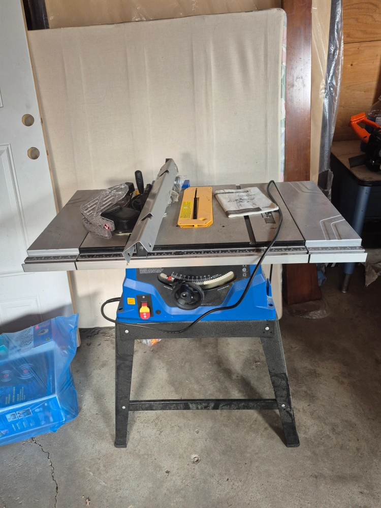 A great tool for precision cutting of wood. The table saw has a blue base and a silver table top, and sits on a sturdy black metal stand. It includes several accessories for safety and ease of use, as well as what appears to be an instruction manual.