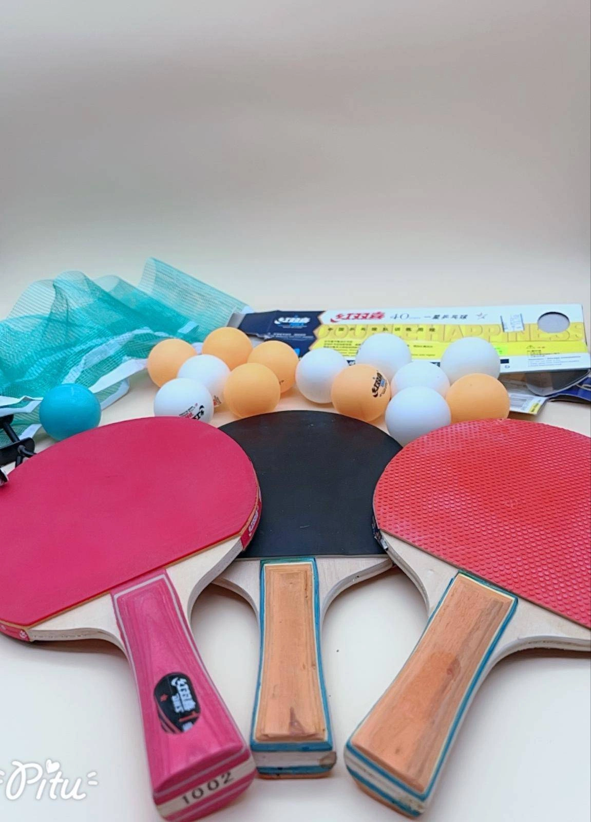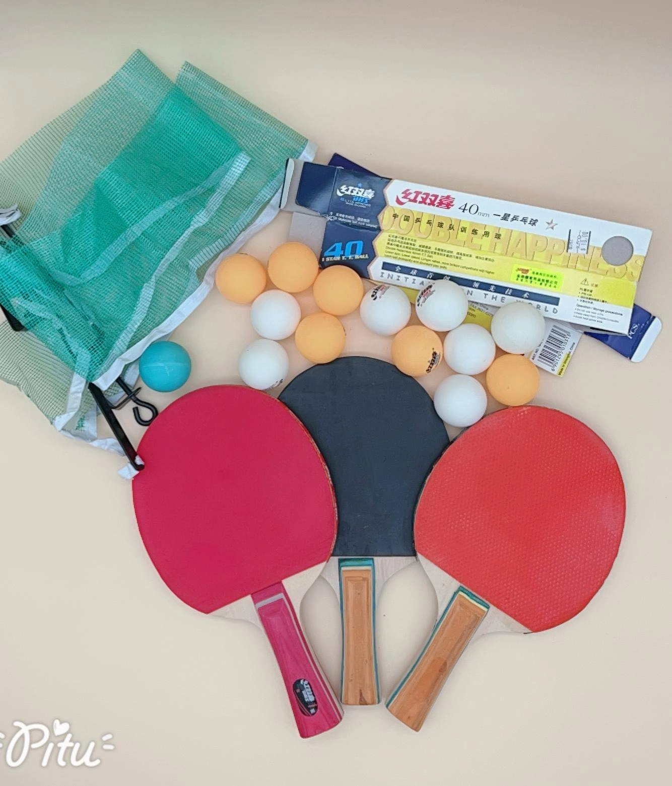 A fun table tennis kit including three paddles with different rubber surfaces, lots of orange and white ping pong balls, and a net for setting up your game anywhere.