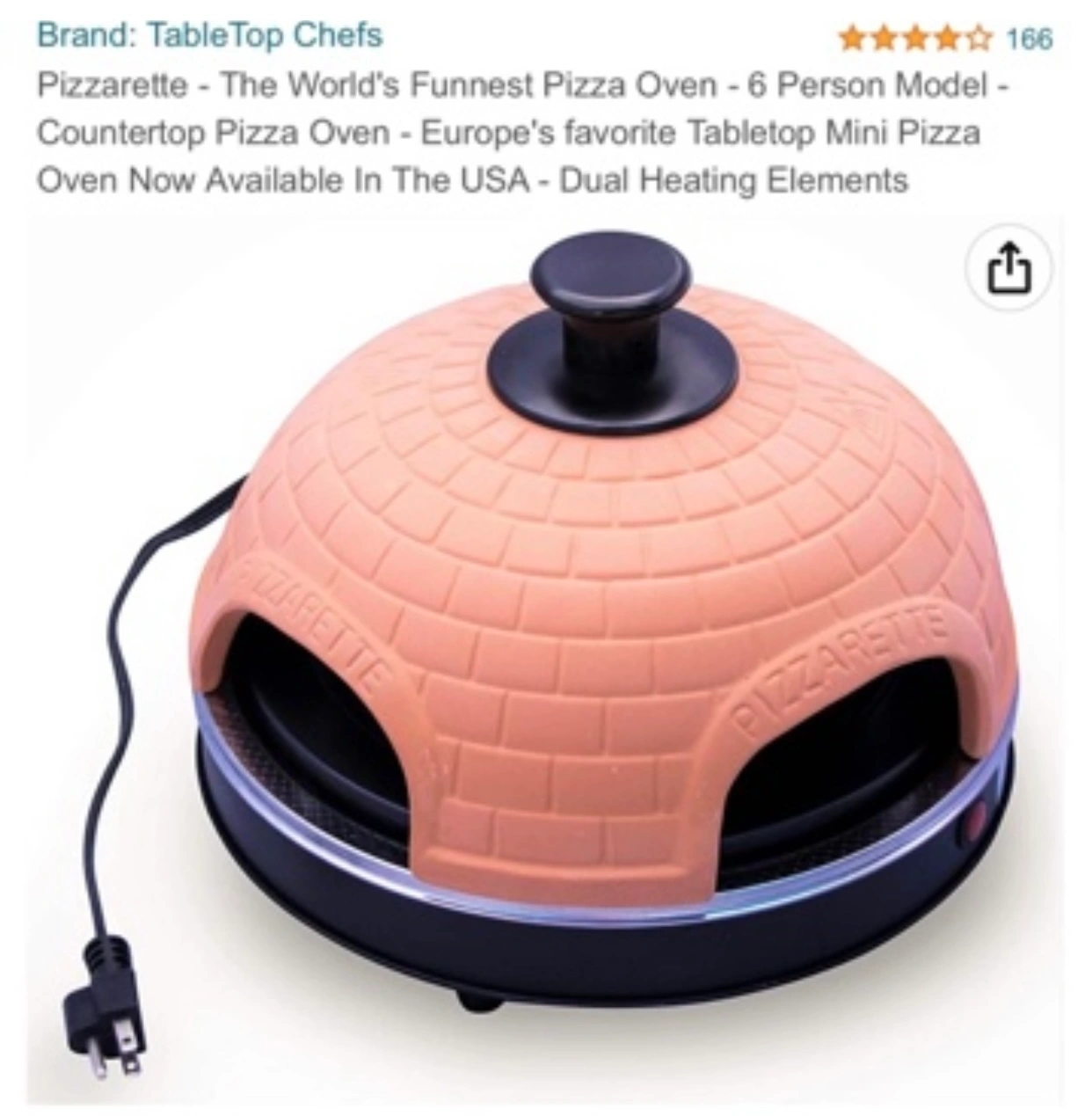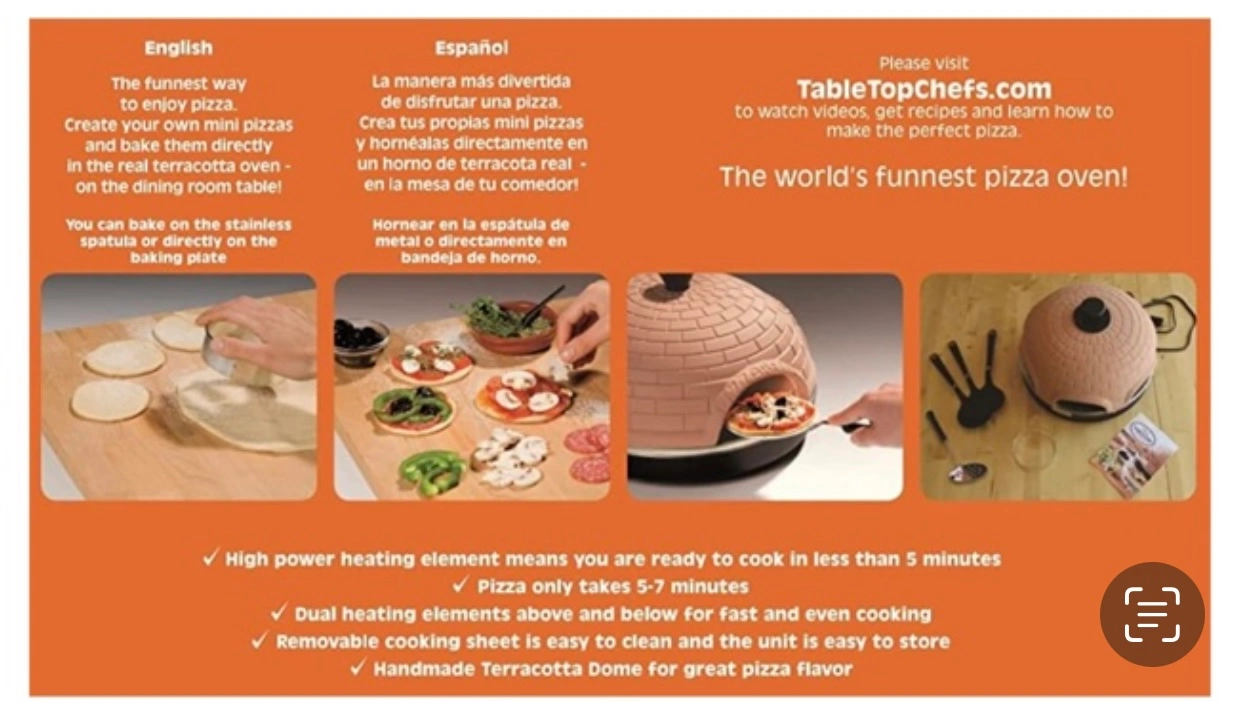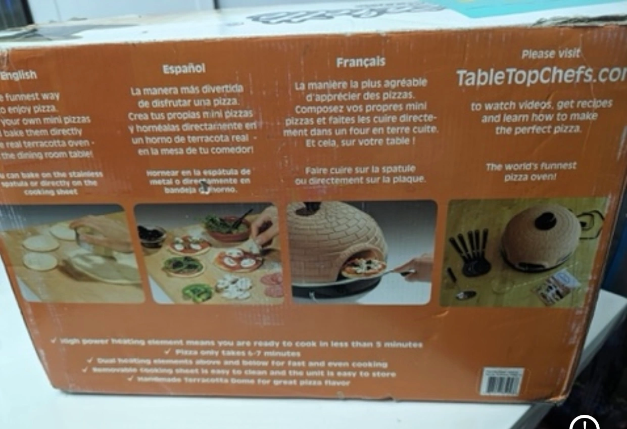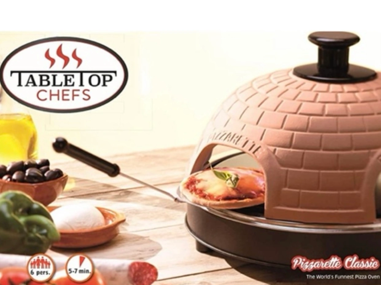 Enjoy making mini pizzas with this TableTop Chefs Pizzarette! It's a fun and unique way to enjoy pizza with friends and family. The high-power heating element means you're ready to cook in less than 5 minutes, and the dual heating elements allow for fast and even cooking. The handmade terracotta dome gives great pizza flavour! Includes accessories to get you started