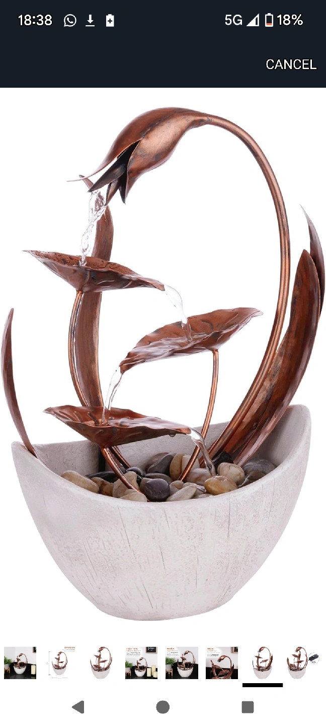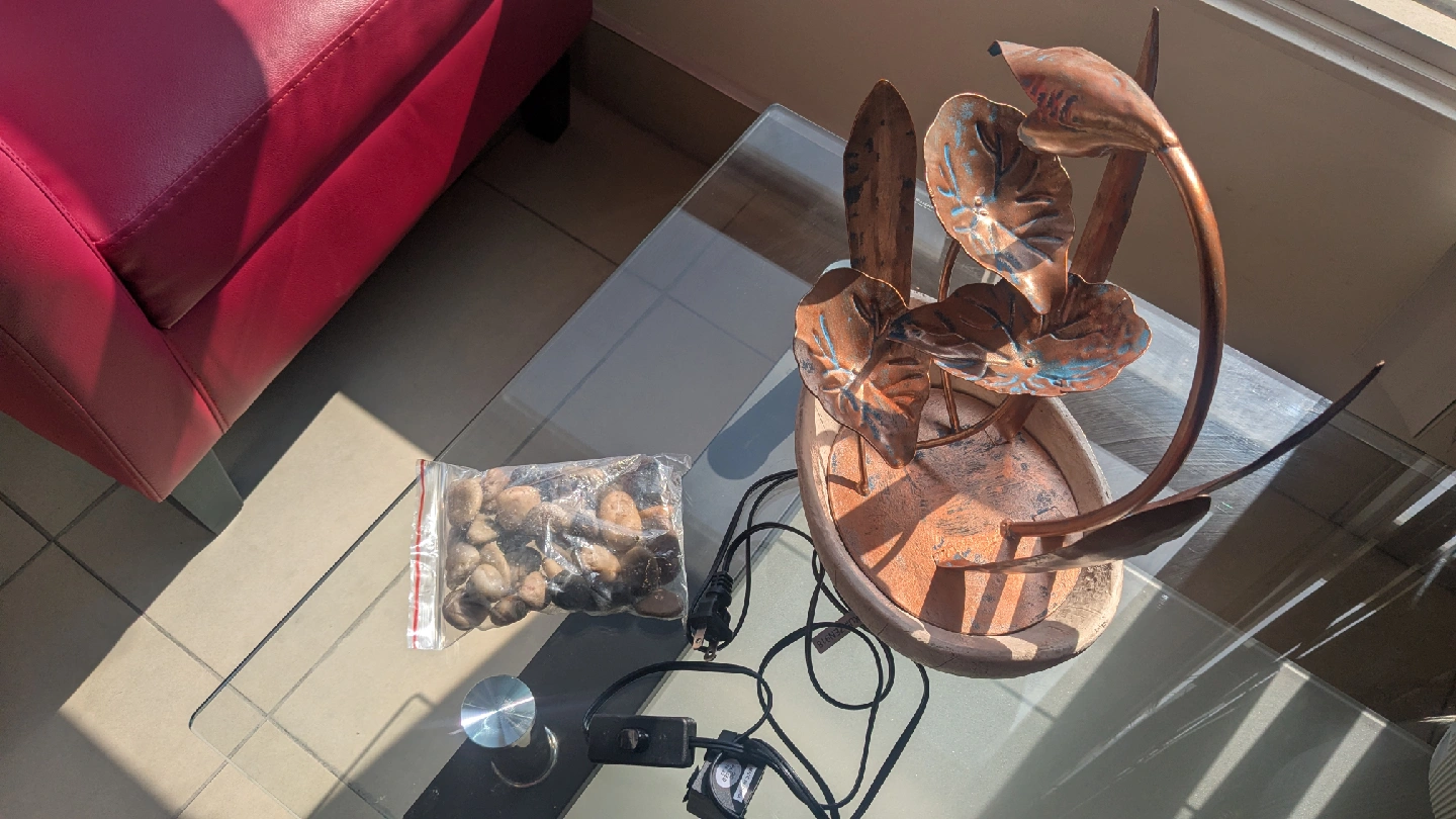 Add a touch of zen to your space with this tabletop water fountain! It features a lovely leaf design and comes with the pebbles to get you started. It's in great condition and ready to bring a calming atmosphere to your home or office