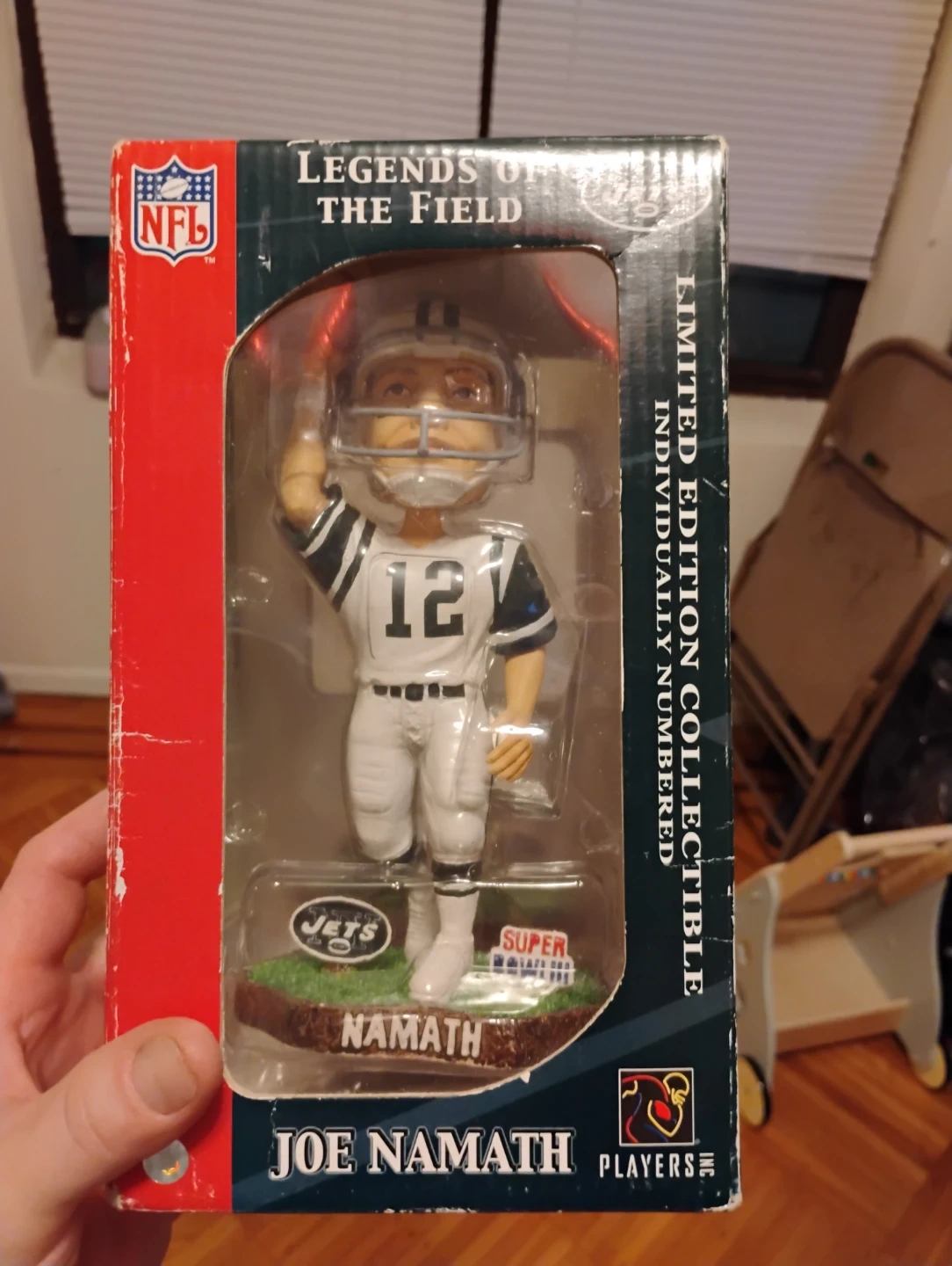 This is a Joe Namath bobblehead from the "Legends of the Field" collection. It's a limited edition collectible featuring the New York Jets quarterback. Comes in its original packaging.