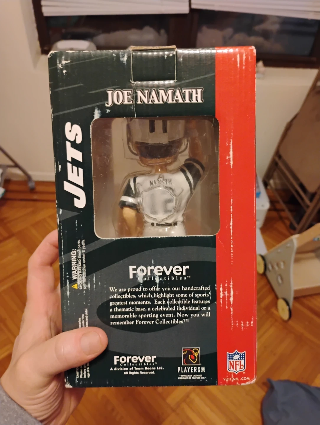 This is a Joe Namath bobblehead from the "Legends of the Field" collection. It's a limited edition collectible featuring the New York Jets quarterback. Comes in its original packaging.