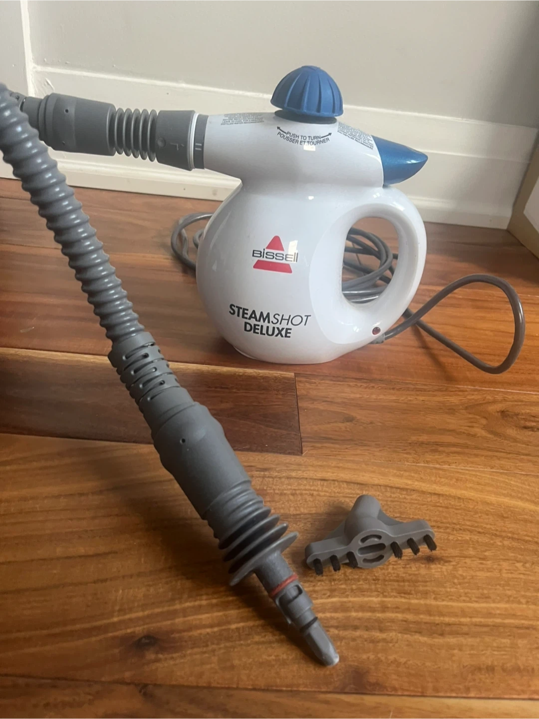 Bissell SteamShot Deluxe handheld steamer. Comes with hose and a precision tip attachment and scrub attachment