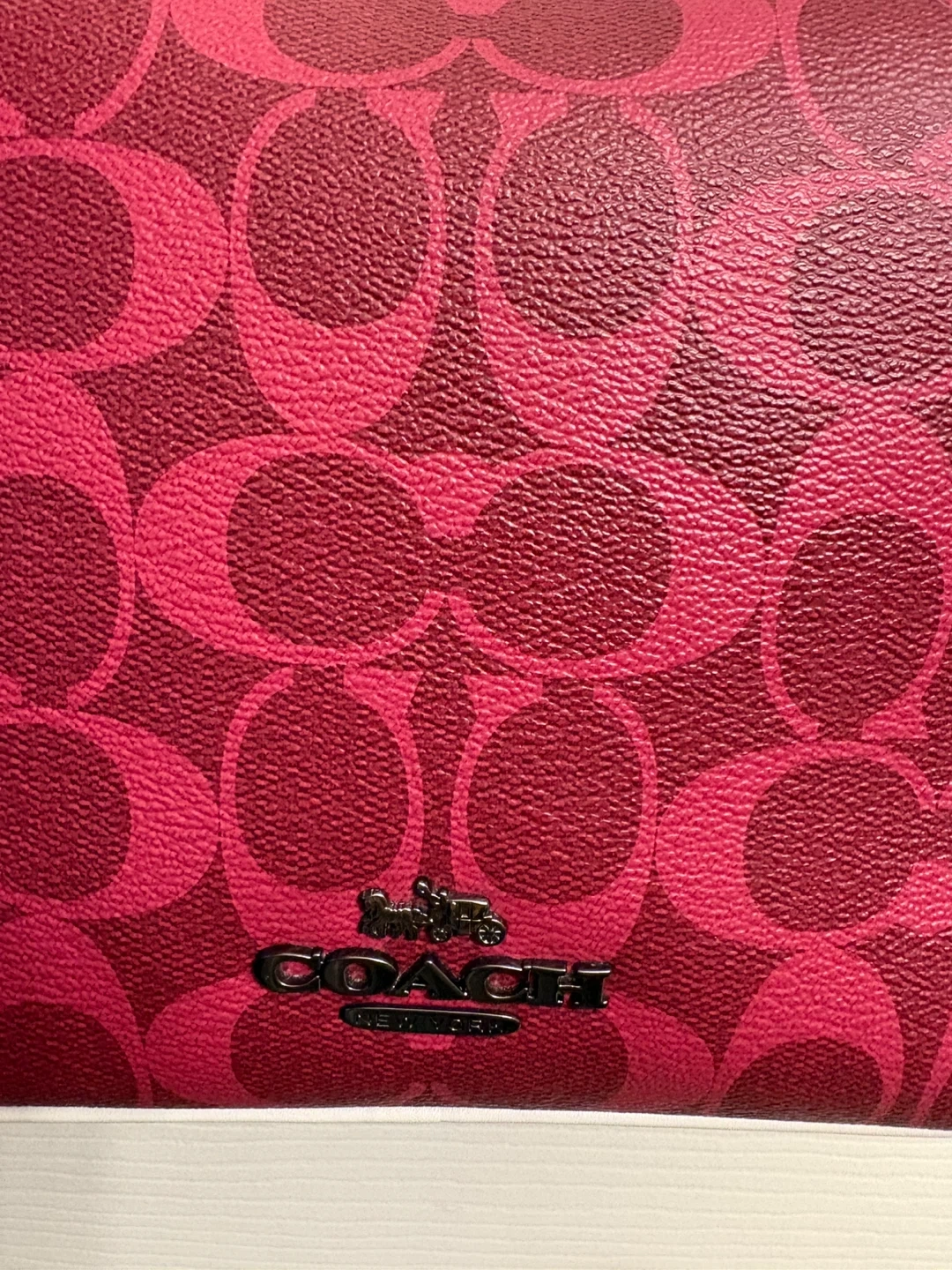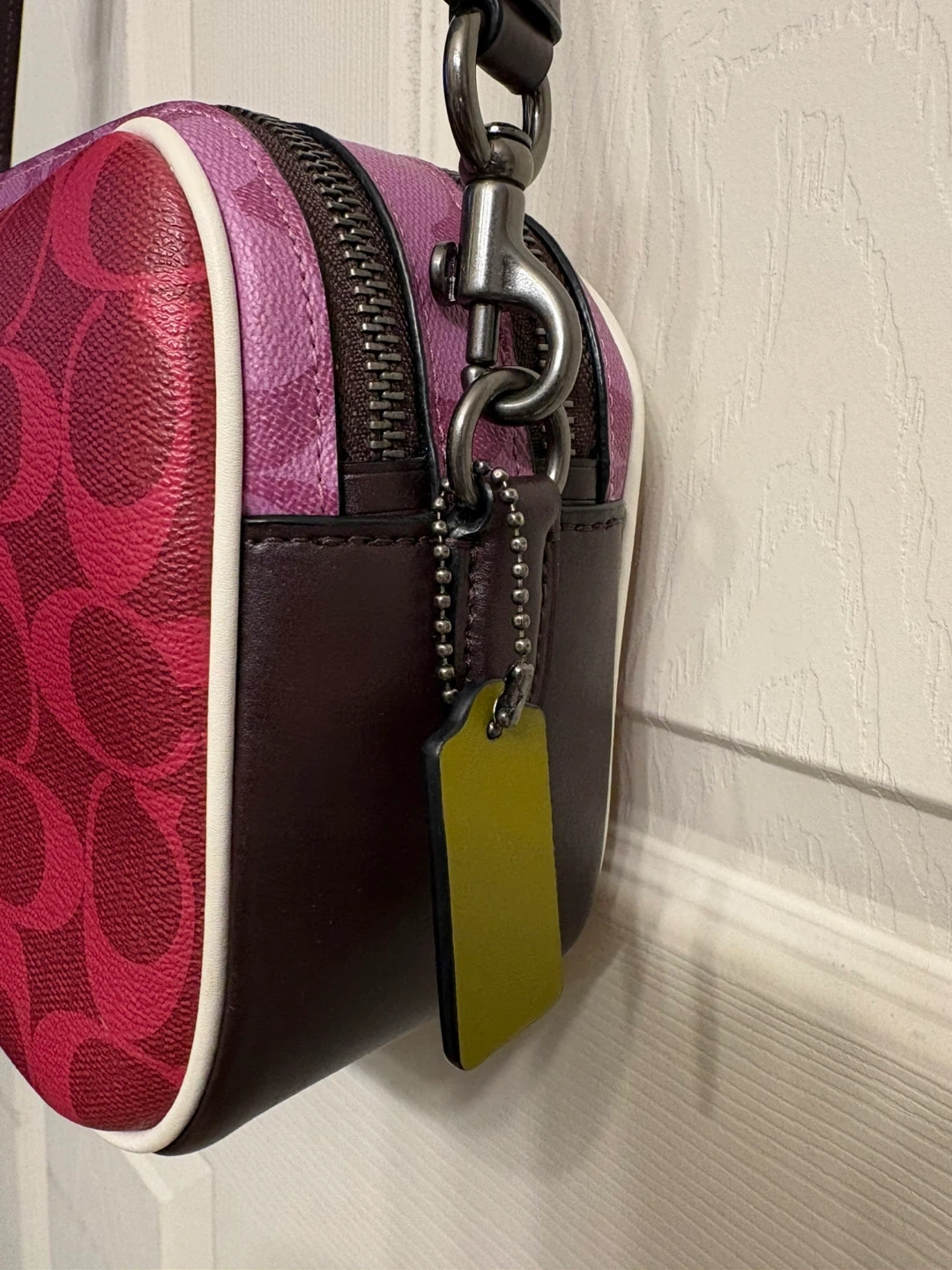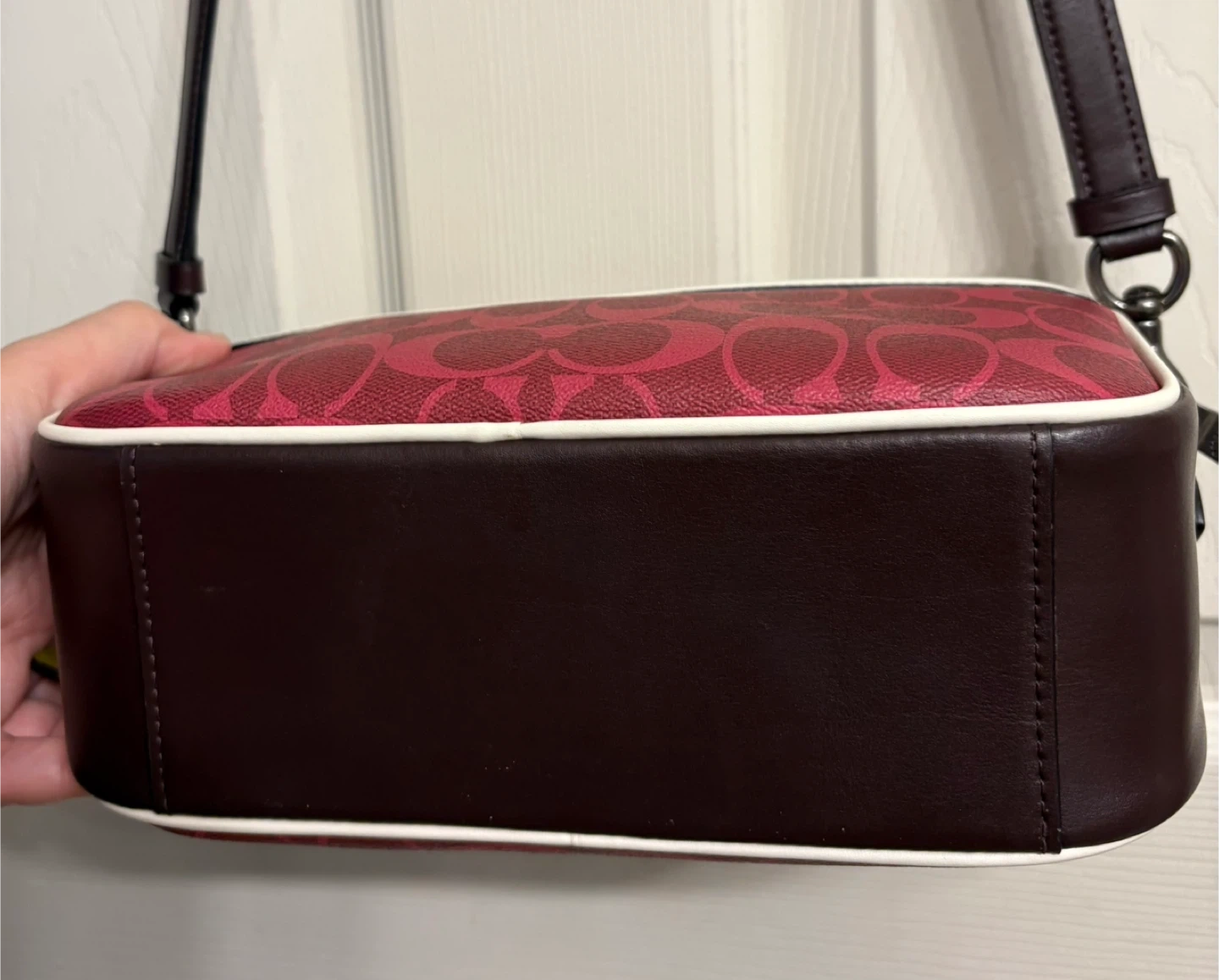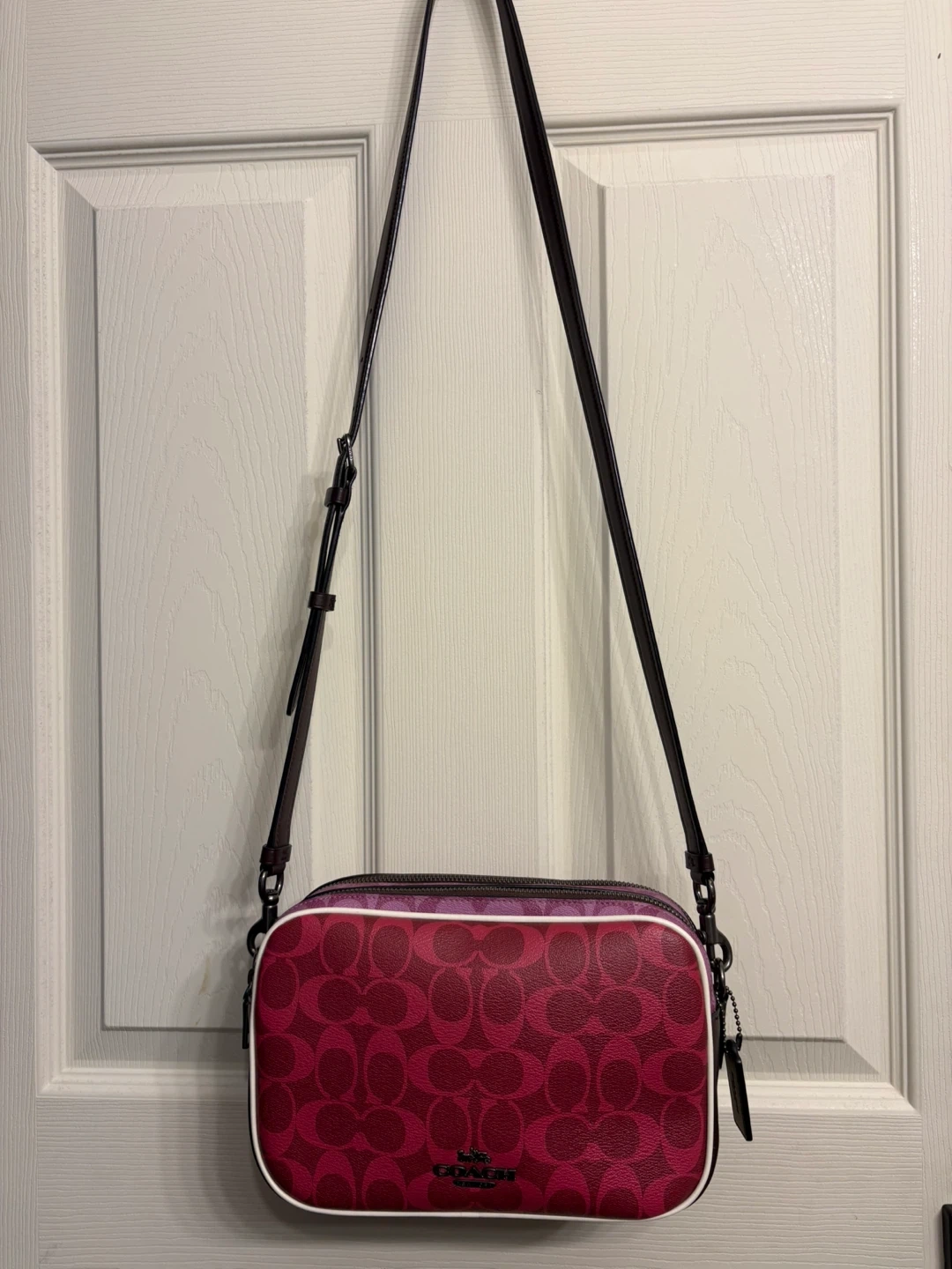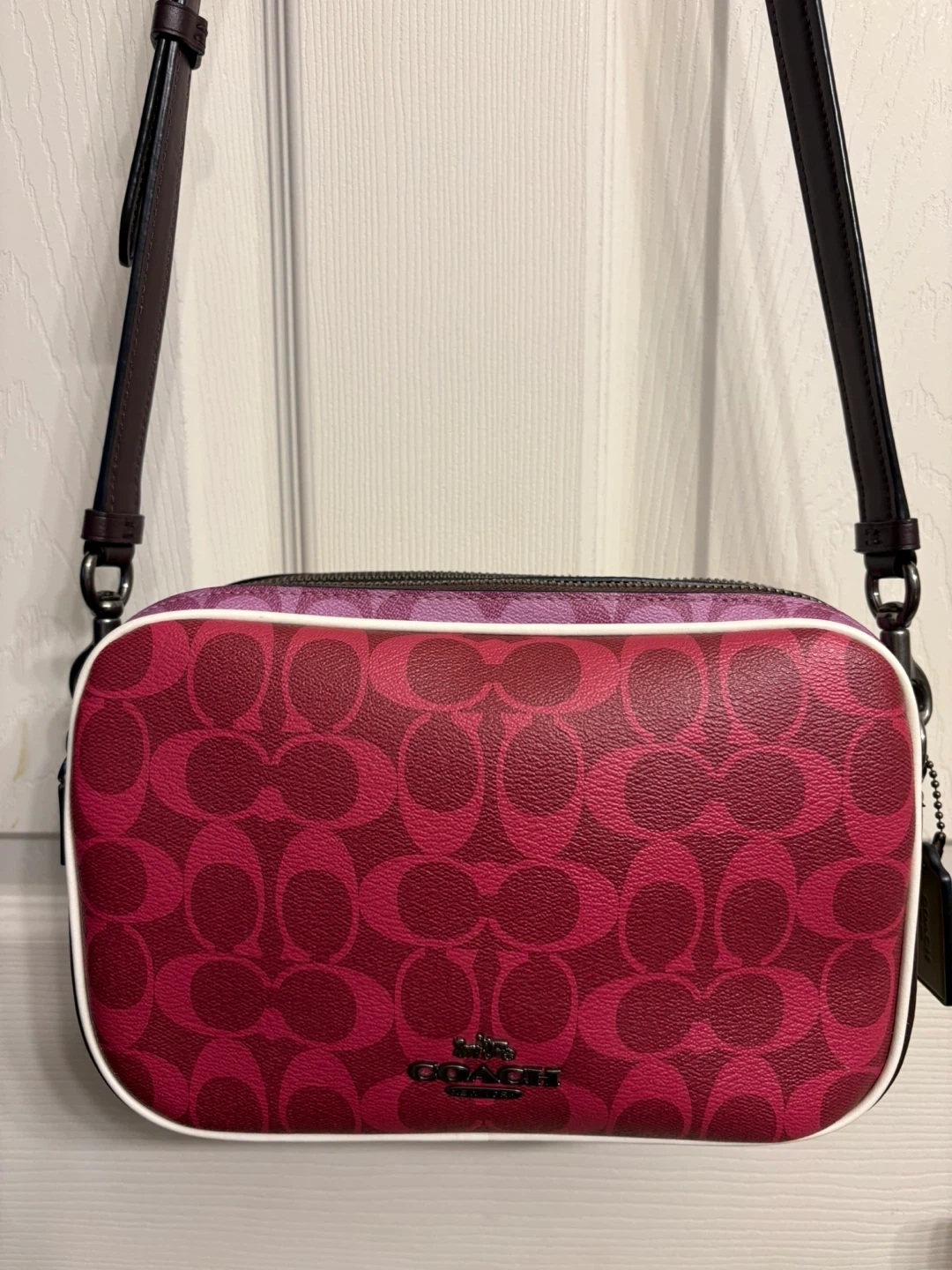 This is a Coach camera bag featuring the signature C pattern. It's a vibrant pink and burgundy colourway with a contrast white piping. The bag has a top zip closure and an adjustable shoulder strap.