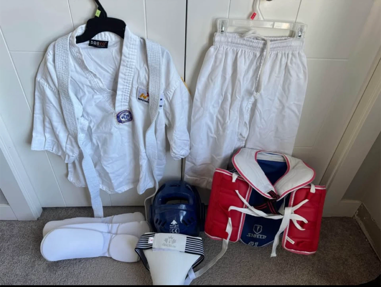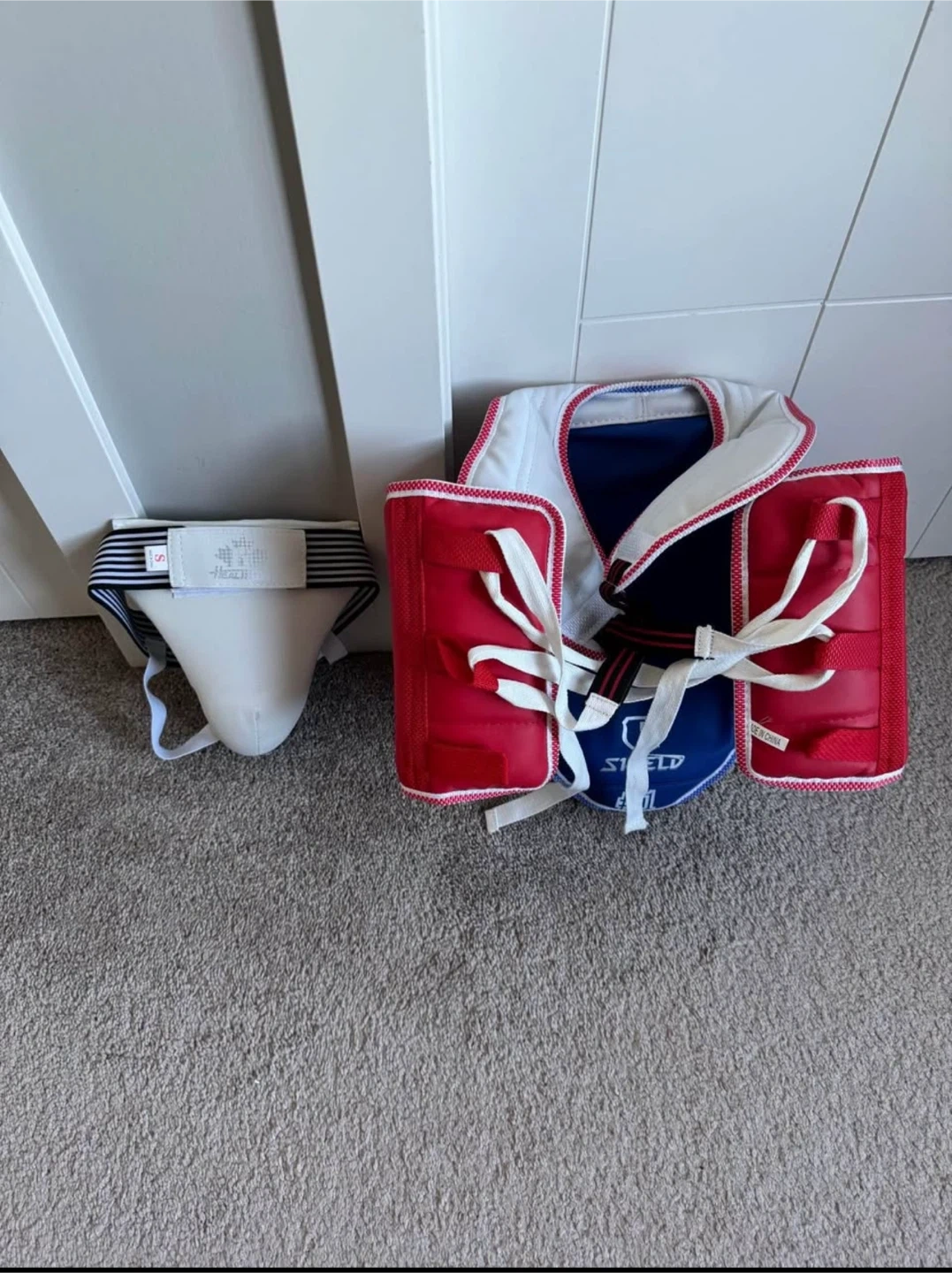 10Selling a complete set of taekwondo protective gear. Includes a chest protector, groin guard, shin guards, arm guards, and a head guard. All in great condition and ready for your next sparring session!