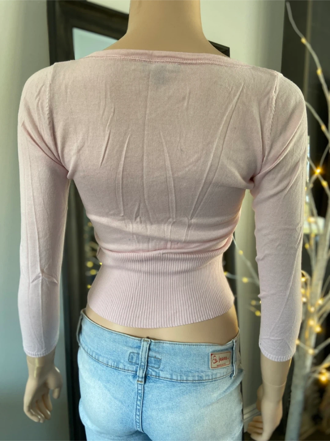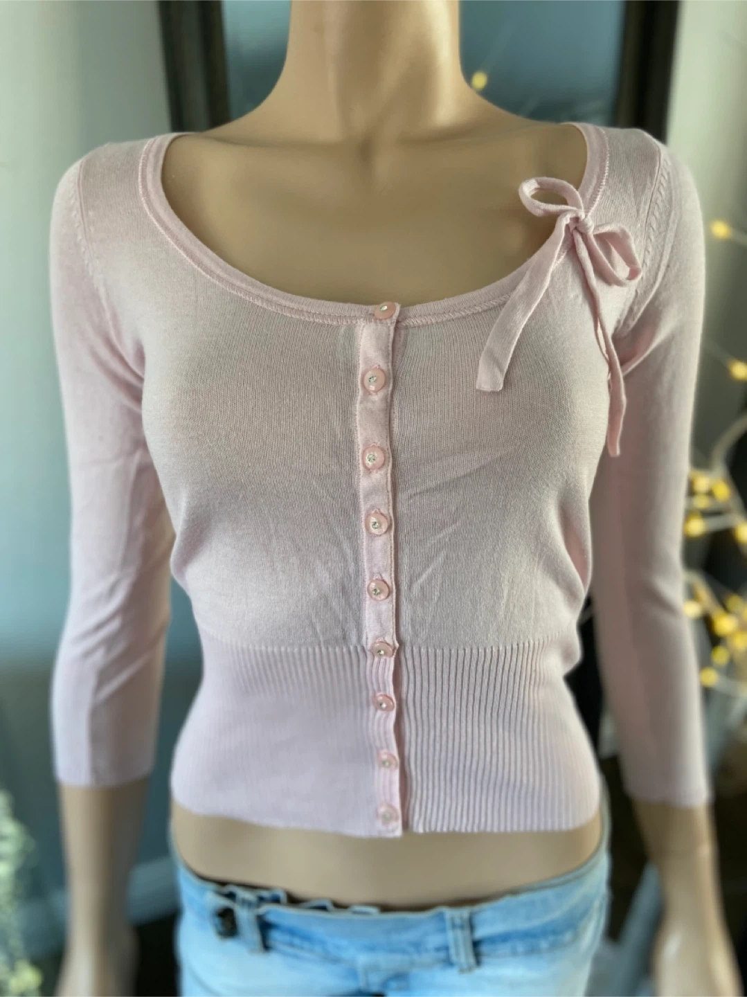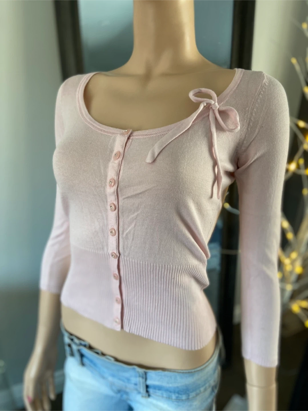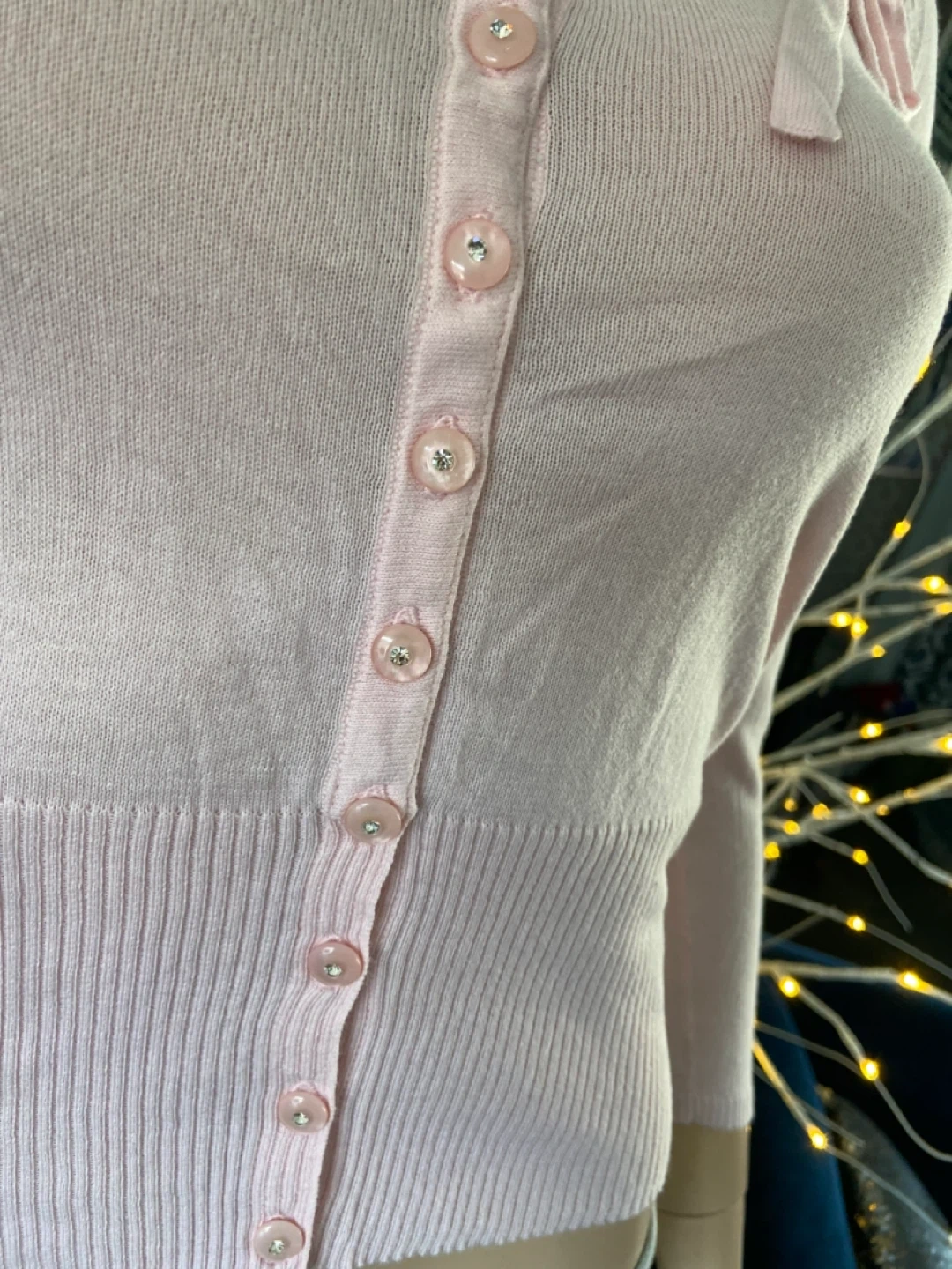 A lovely light pink cardigan with a button-up front and a cute bow detail on the neckline