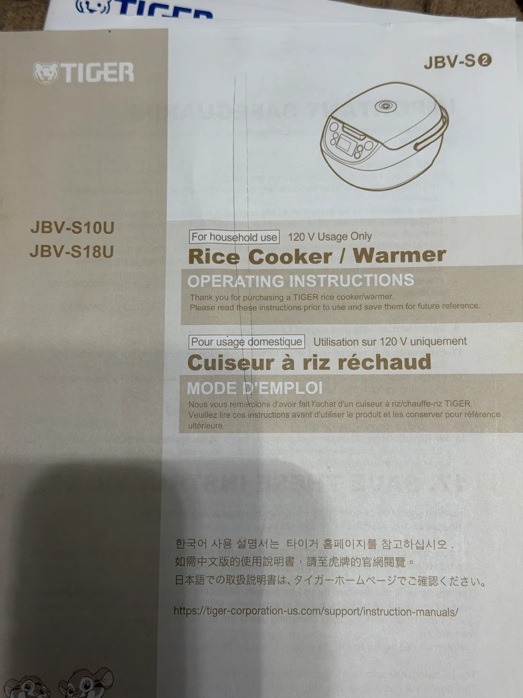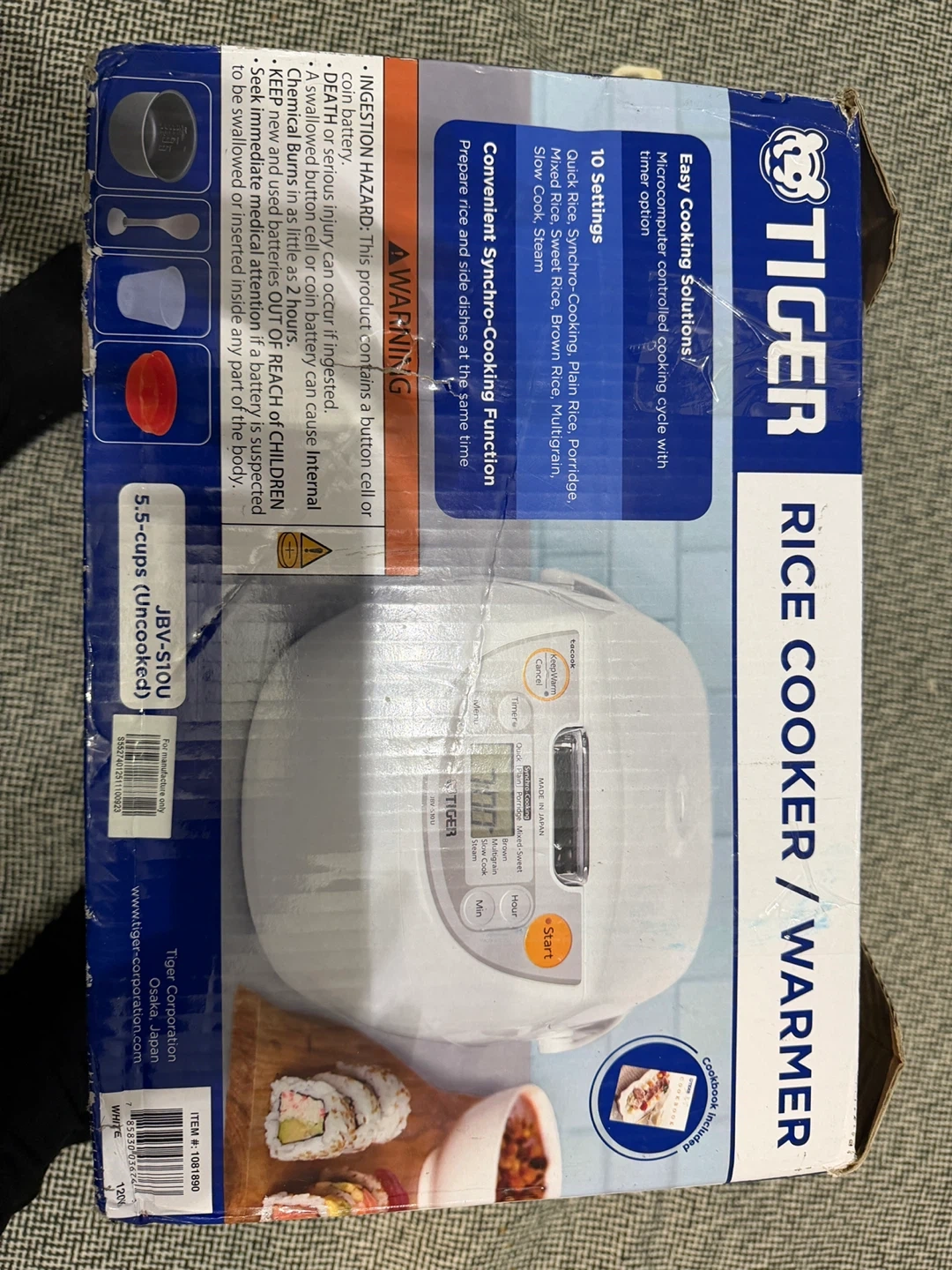 This is a Tiger rice cooker and warmer, model JBV-S10U. It features microcomputer controlled cooking with 10 settings, including Synchro-Cooking and quick cook options. Made in Japan.