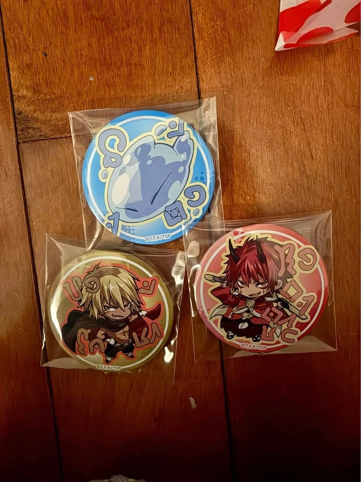 Brand new Tensura (That Time I Got Reincarnated as a Slime) badges featuring Rimuru, Benimaru, and Veldora. These were won from an in-person gacha event and come in their original plastic covers. Let me know if you're interested!