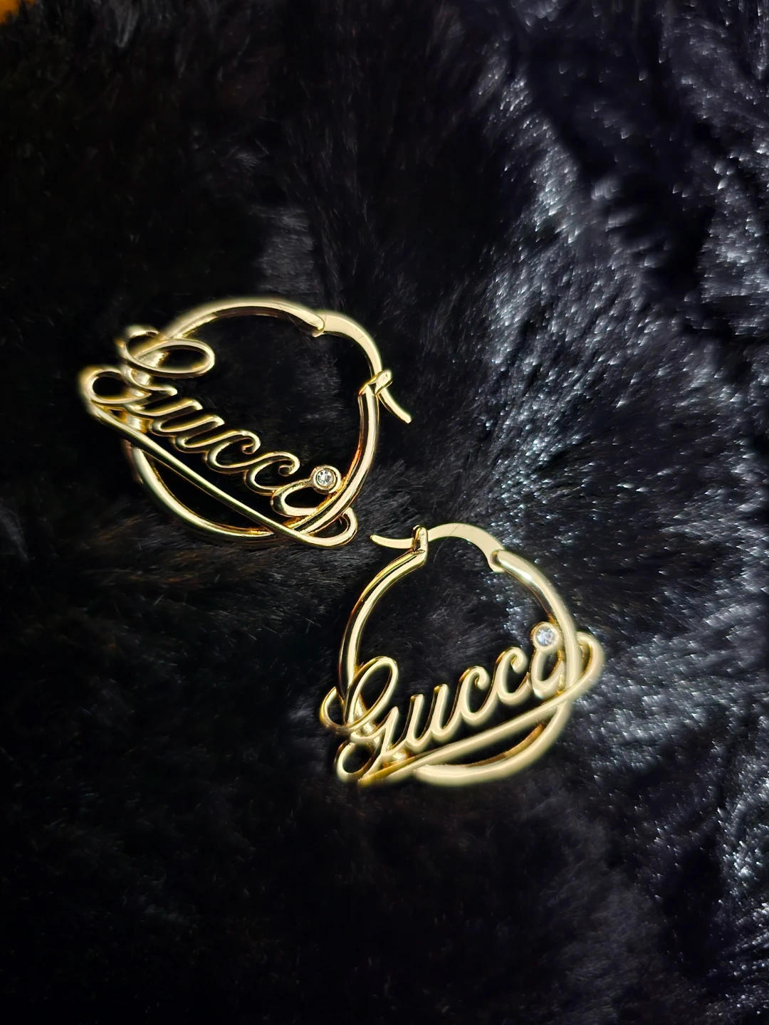 These are Gucci hoop earrings in a gold tone finish. They feature the Gucci logo script with a small crystal accent. Includes original box and dust bag.