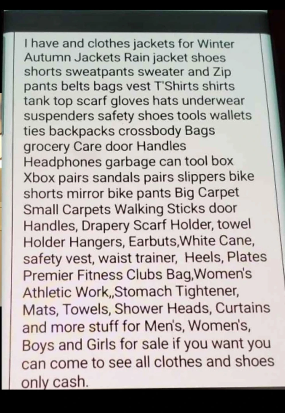I have Track Pants for Men's and Boys and size XS/ S/ M / L / XXL/ 2XL AND 3XL different price different colors and different Brand if you want you can come to see all Track Pants only cash.