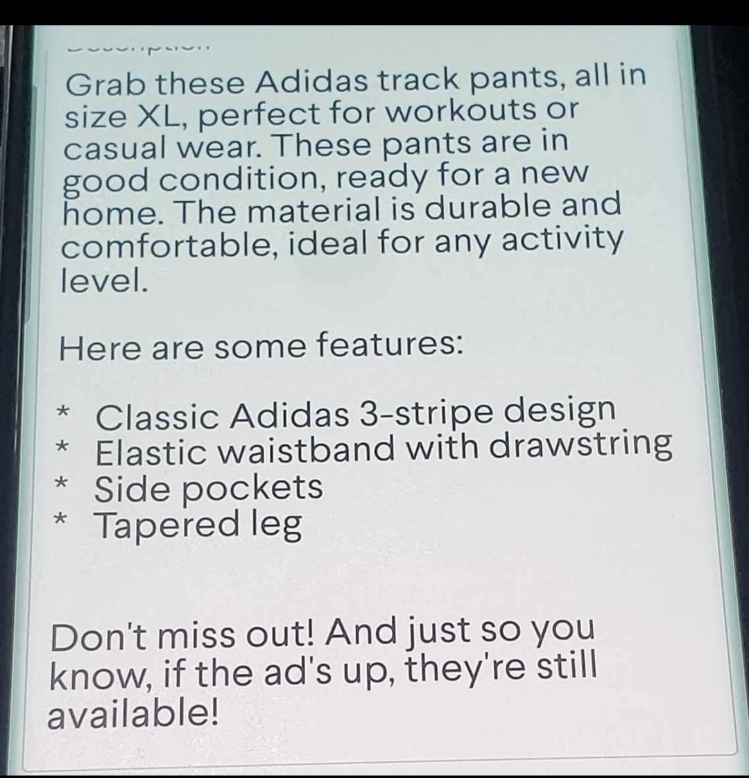 This Track Pants is very good condition and please message for the price for the page and for the number Track Pants, because I have different price.